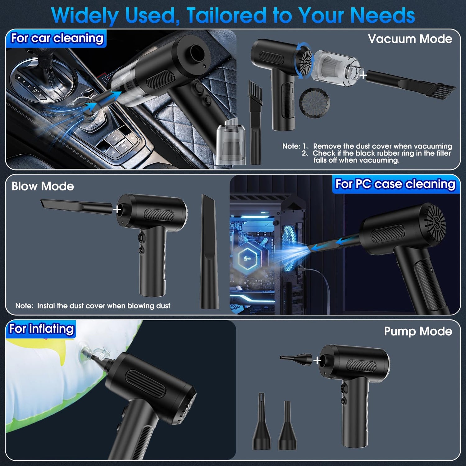 • ✨【Compressed Air Duster and Vacuum, Pump】Not only a compressed air duster, but also a handheld car vacuum for keyboard or cars, frames that is compact, lightweight and easy to use. Freely switch to compressed air duster or car vacuum cleaner mode according to your needs, easily removes dirt, debris, dust, pet hair, and deeply embedded dirt, also blow up swimming rings or blowing BBQ charcoal etc.