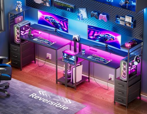 Korfile 48 Inch Gaming Desk with LED Lights & Power Outlets,Computer Desk with Fabric Drawers & Side Hook,Reversible Gamer Table with Monitor Stand for Game Room,Home Office,Carbon Fiber Black
