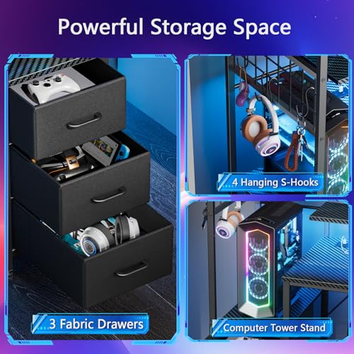 - 【Ample Storage Space】Maximize your space and minimize distractions with our thoughtfully designed organization system. It features 3 fabric drawers, 4 side hooks, and a reversible storage shelf that's perfectly sized for your gaming PC tower. Keep all your essentials neatly stored and right at your fingertips, so you can maintain a clean desk and a clutter-free mind, fully focused on what truly matters.