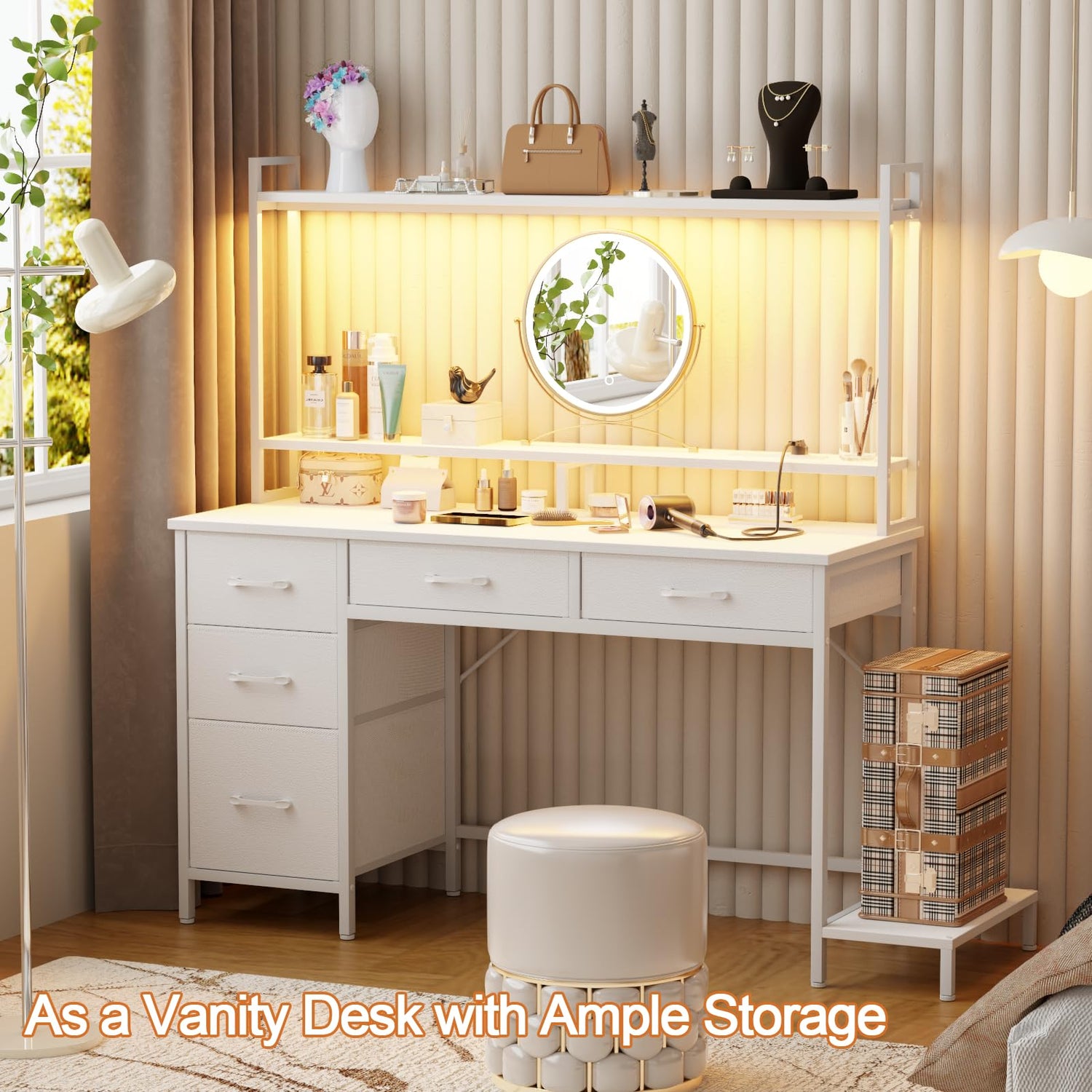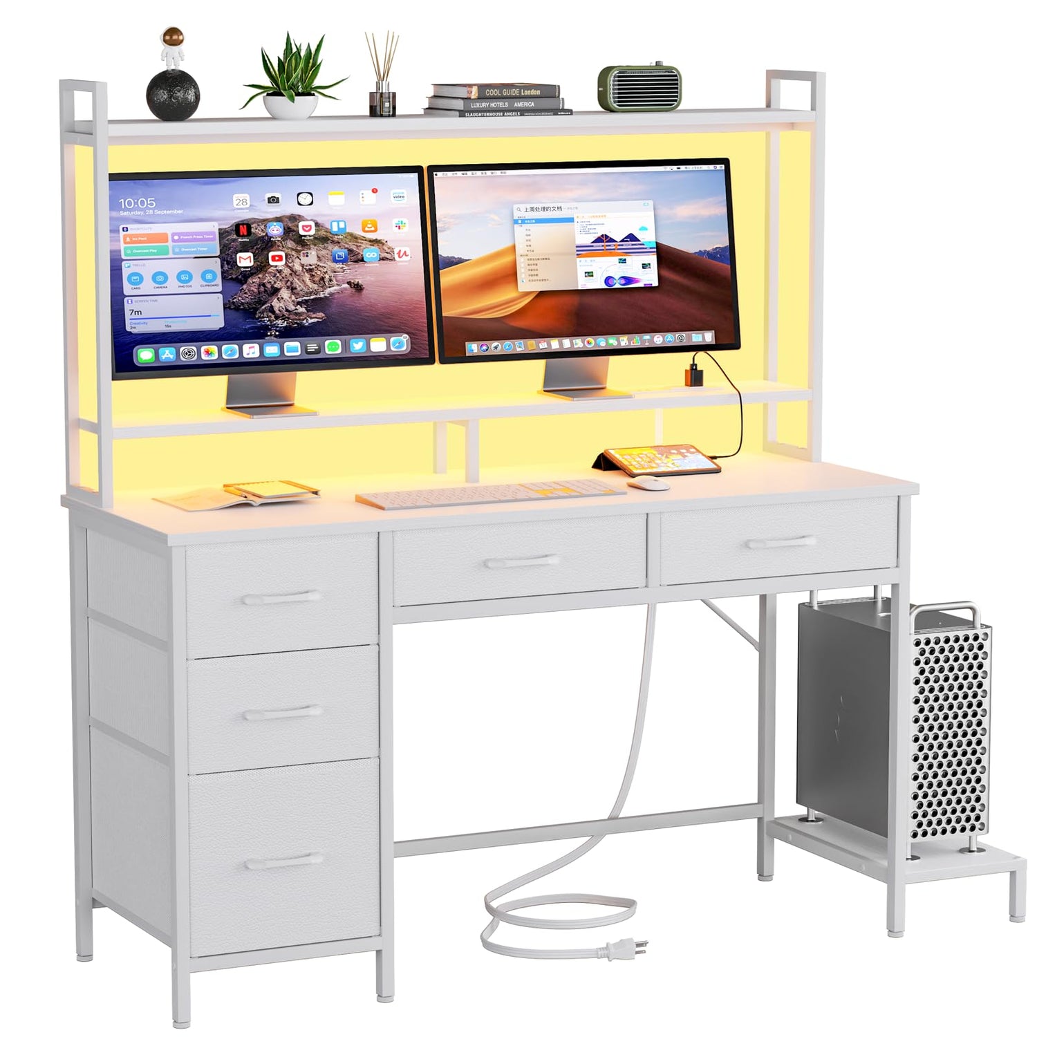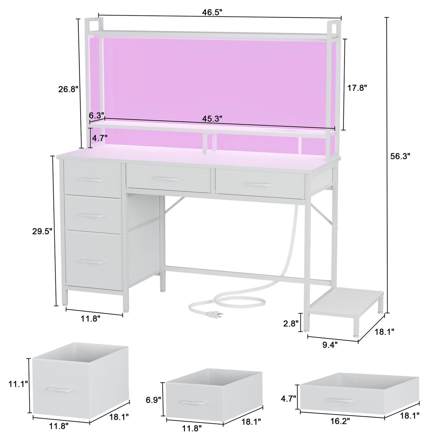 Details: Korfile Computer Desk with Hutch, White Gaming Desk with Power Outlets & LED Ligthts & 5 Fabric Drawers, Home Office Desk with 2 Tiers Storage Shelves for Display, 47" PC Gamer Table for Bedroom
