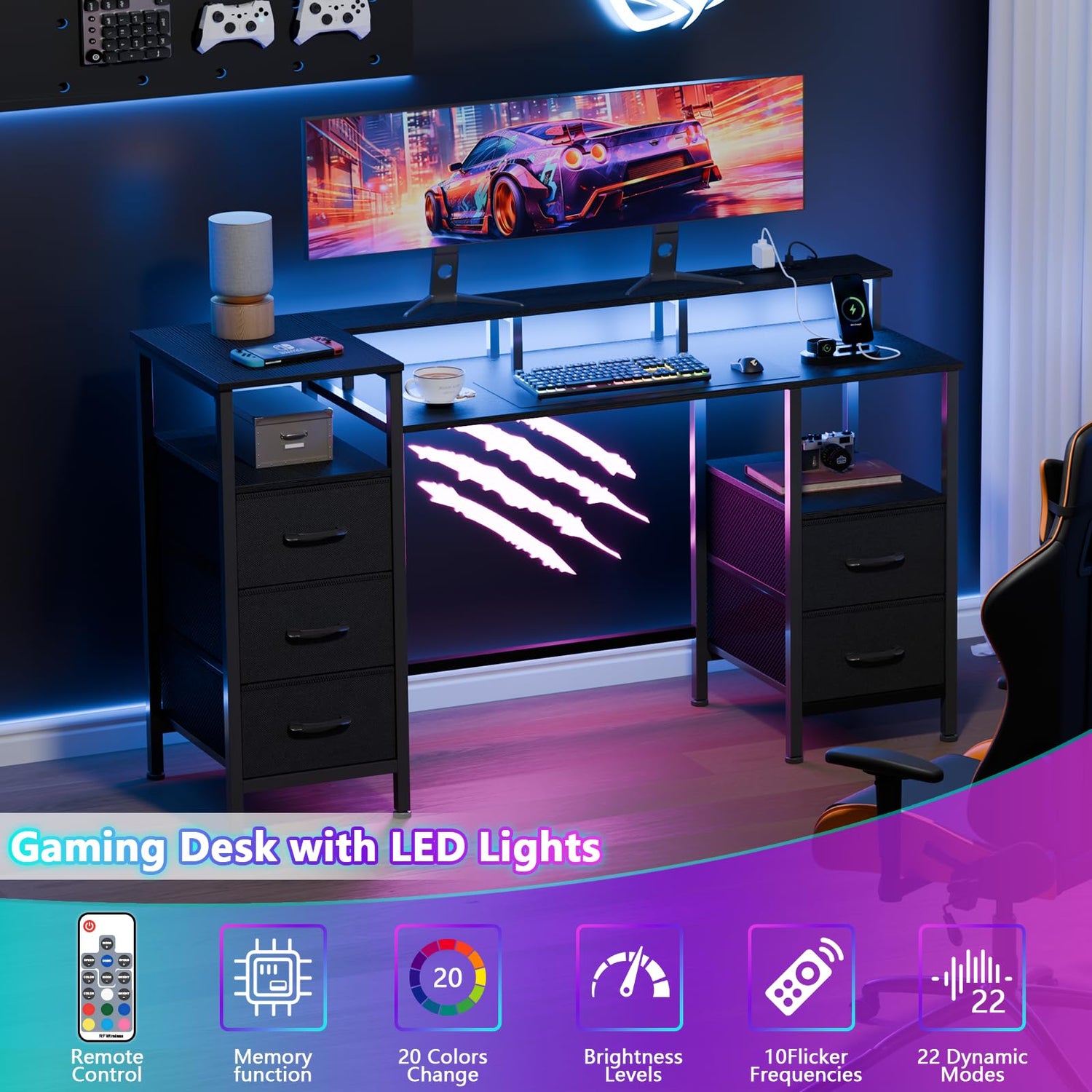 - Table with LED Lights: Gaming table with built-in RGB LED light strips to adjust the atmosphere for a better gaming experience. You can choose different modes and colours to decorate the room according to different use scenarios work or games.
