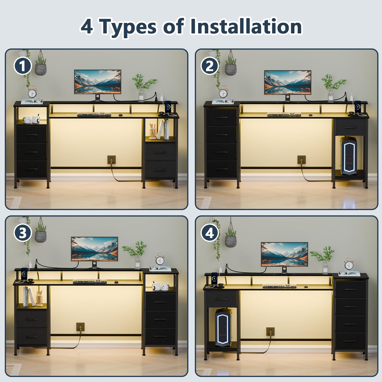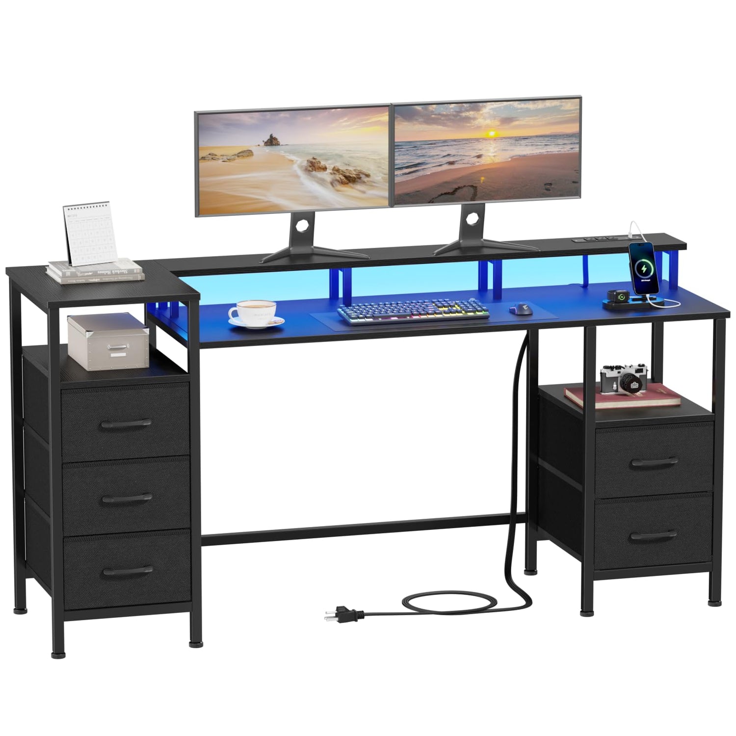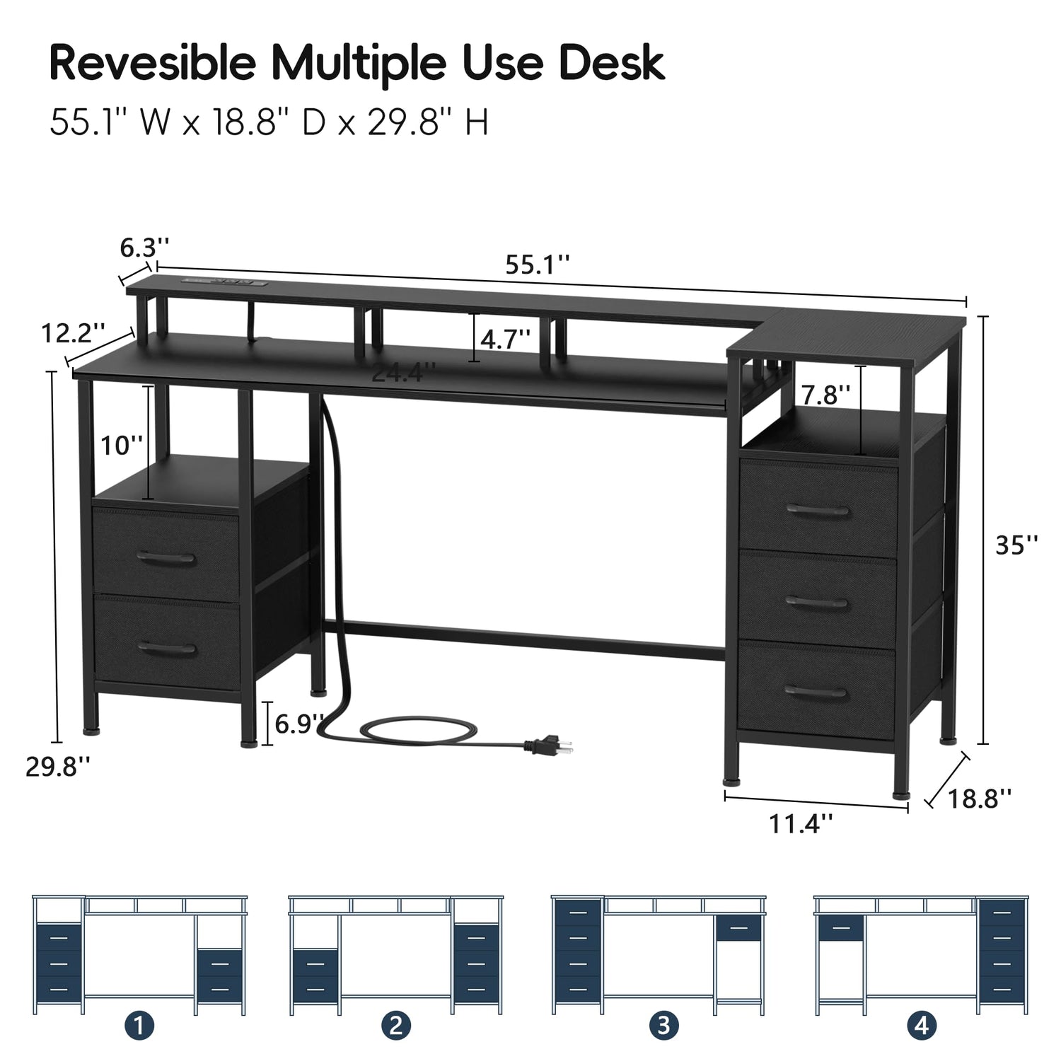 Korfile Computer Desk with Power Outlets & LED Lights, Gaming Desk with 5 Fabric Drawers for Bedroom, 55 Inch Home Office Desk with Monitor Stand & Storage Shelves for Working, Black