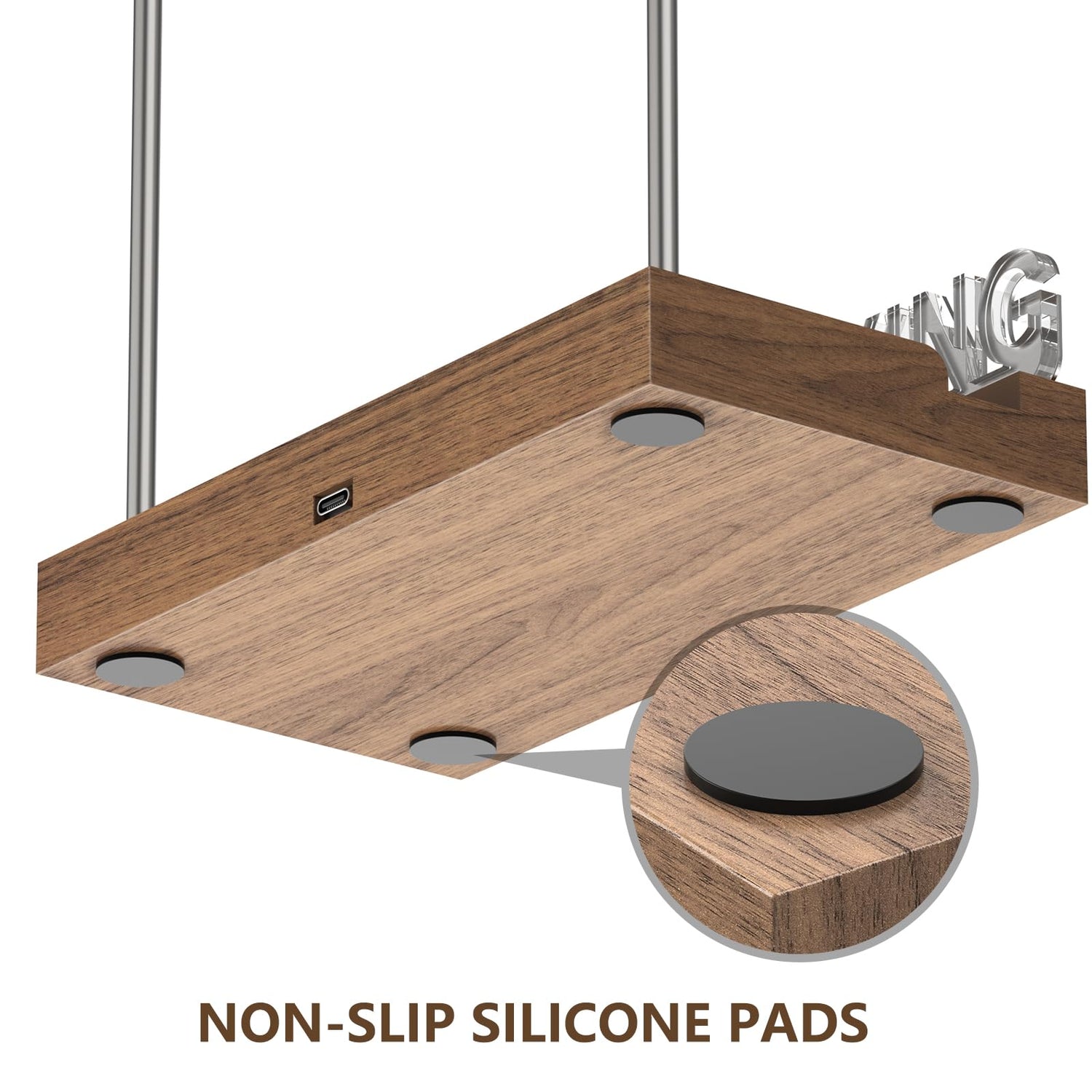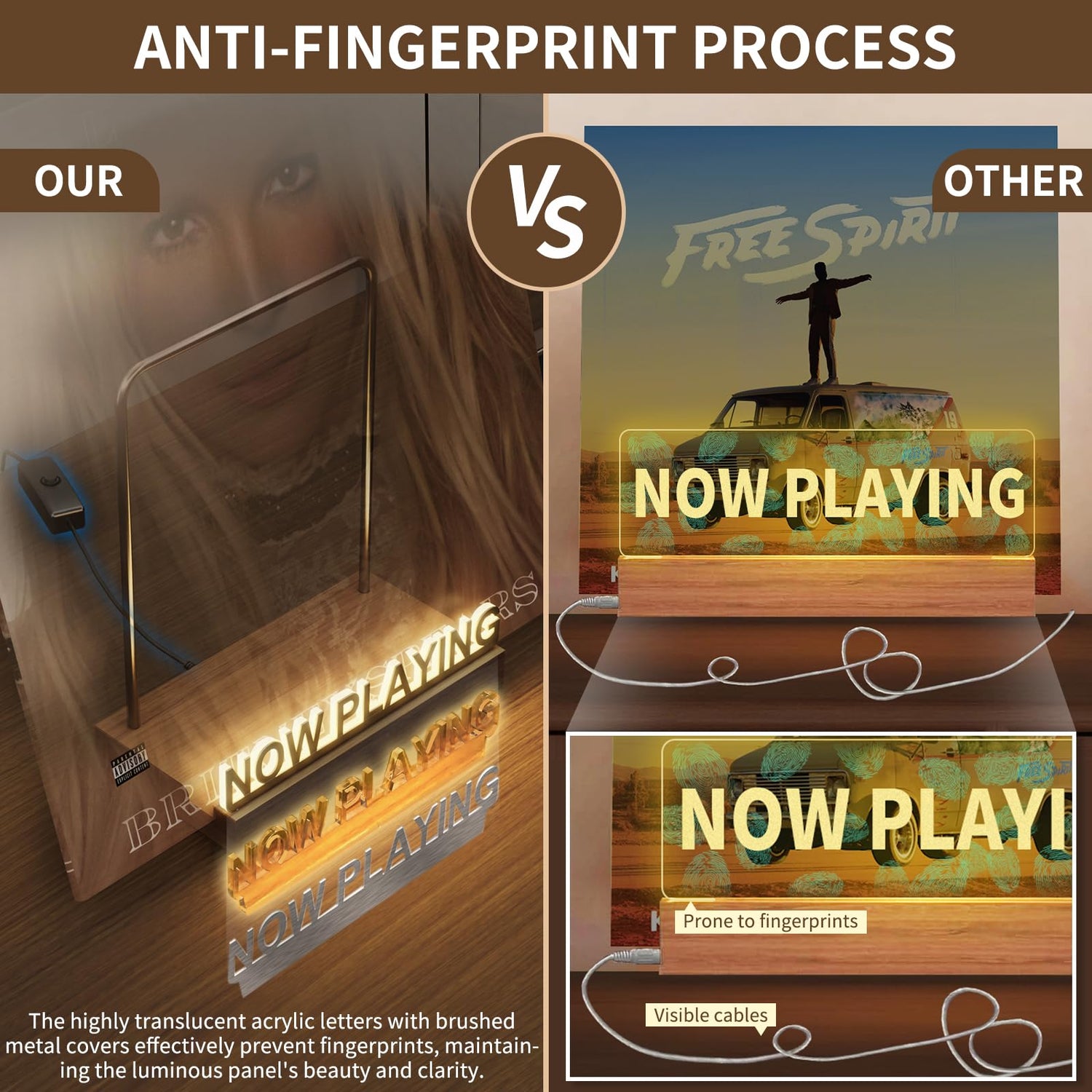 - 【Unique Design】Our Light up Now Spinning Record Stand features a Type-C outlet on the back of the wood base, powered by a USB cable, This design makes the power cable and outlet invisible from the front, and there is an on/off switch on the cable to control the light. The highly translucent acrylic letters with brushed metal covers effectively prevent the acrylic from fingerprints, dirts and scratches.