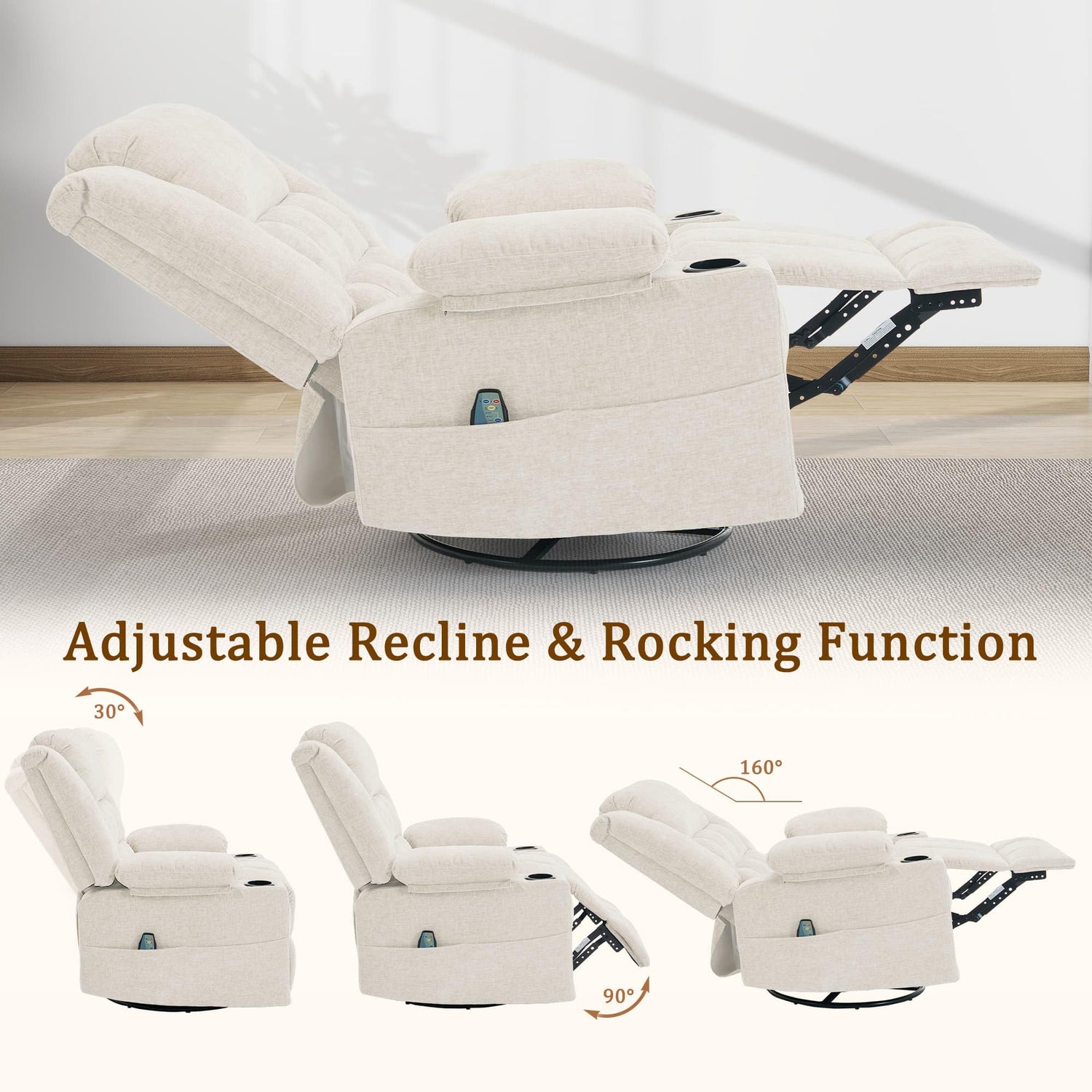 Korser 360° Swivel Rocker Recliner for Adults, Nursery Glider Recliner with Massage and Heating, Rocking Chair with Cup Holder, Manual Recliner Chair for Living Room, Bedroom (Fabric, Beige)