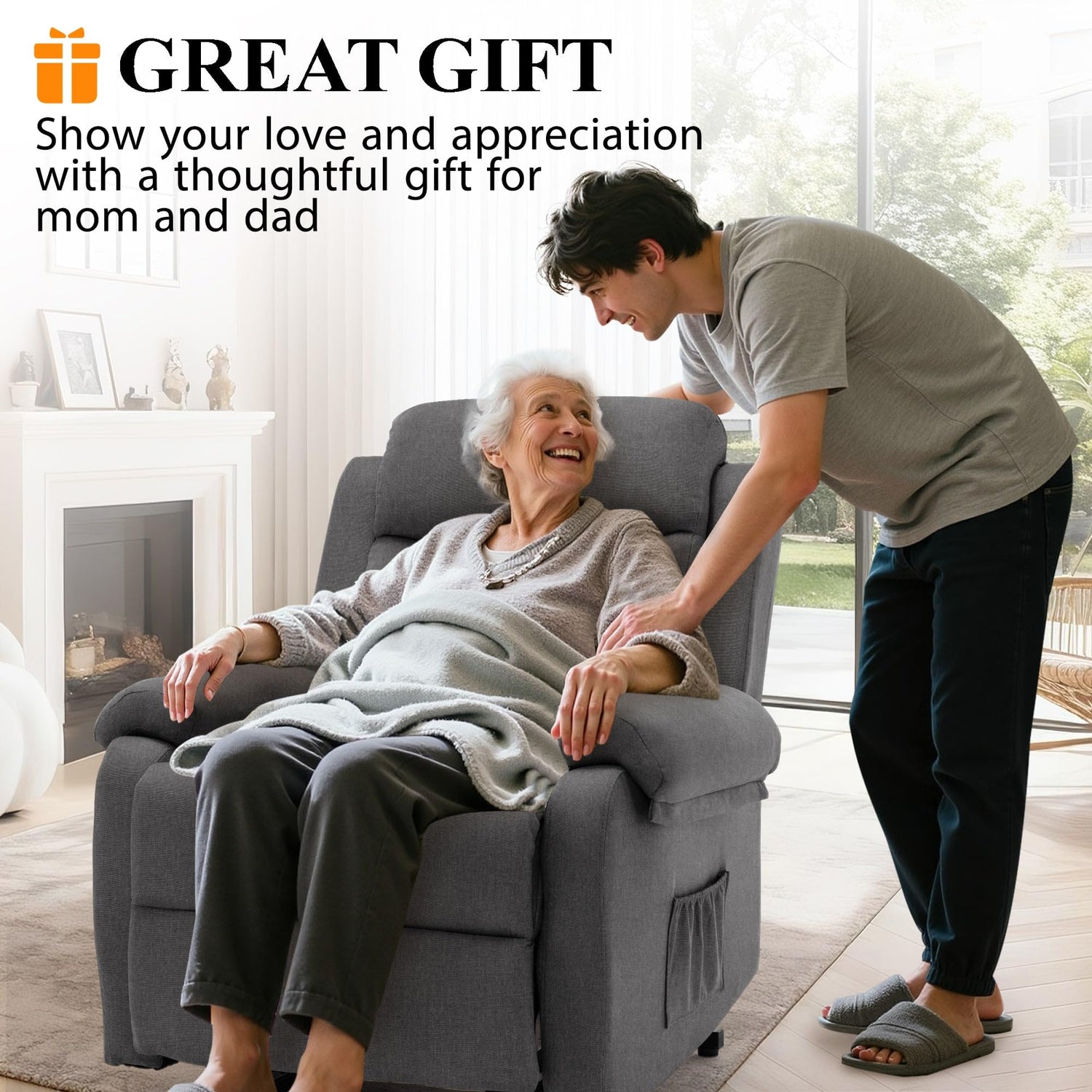 - Power Lift & Recline: This power lift recliner features an advanced electric mechanism that seamlessly combines lifting and reclining functions. With a simple button press, you can effortlessly find your perfect comfort position, from an upright seat to a fully reclined 150-degree angle. For those who need assistance standing up—especially seniors—the lift chair can also gently tilt forward, providing steady support to rise smoothly and safely, without straining the knees.