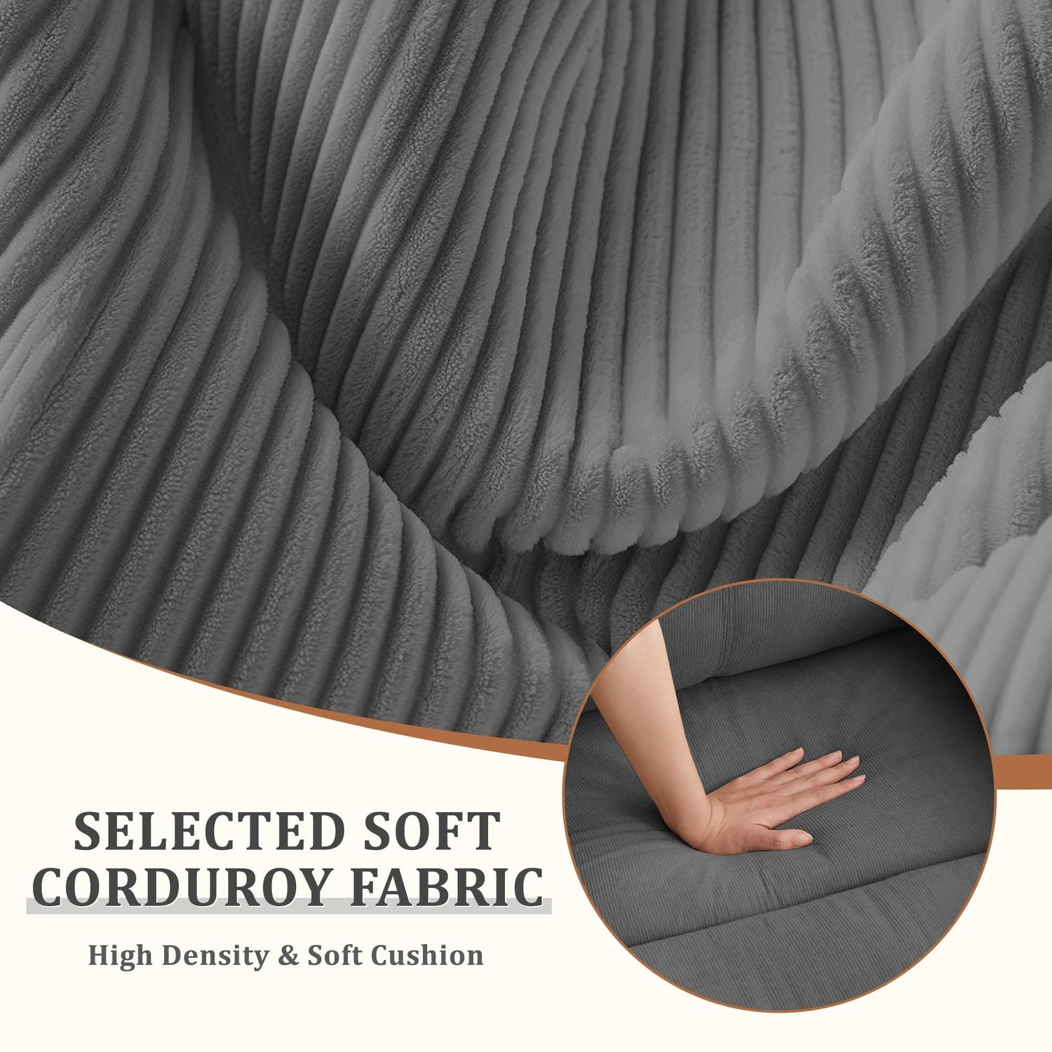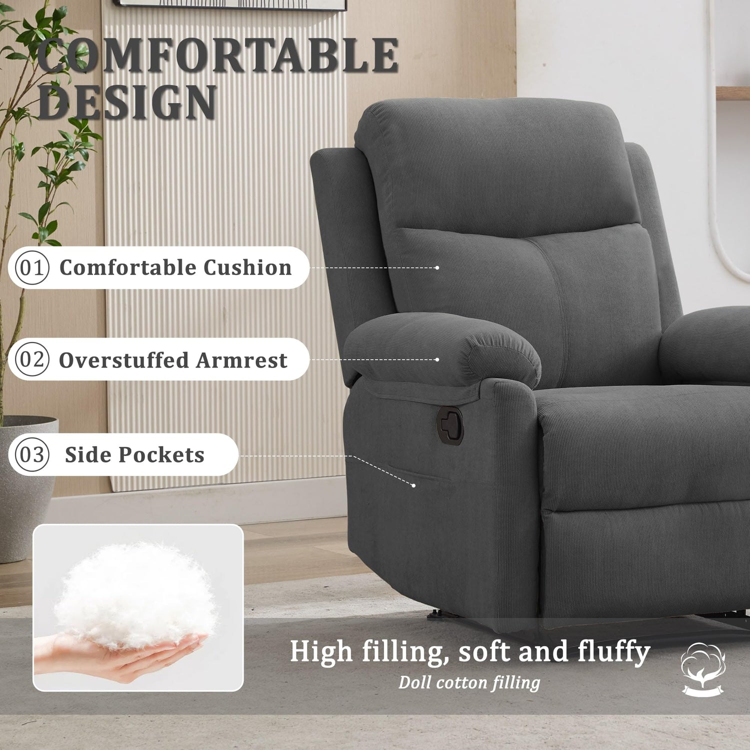 - High-quality Corduroy & Cloud-like Softness: Crafted from soft, breathable corduroy, this recliner chairs for adults offers year-round comfort in any season. Inside, a high-density sponge filling in the back, seat, and armrests provides cloud-like, supportive cushioning that gently contours to your body. For optimal fluffiness upon arrival, simply pat the backrest and armrests—the sponge will bounce back to its full, supportive shape.