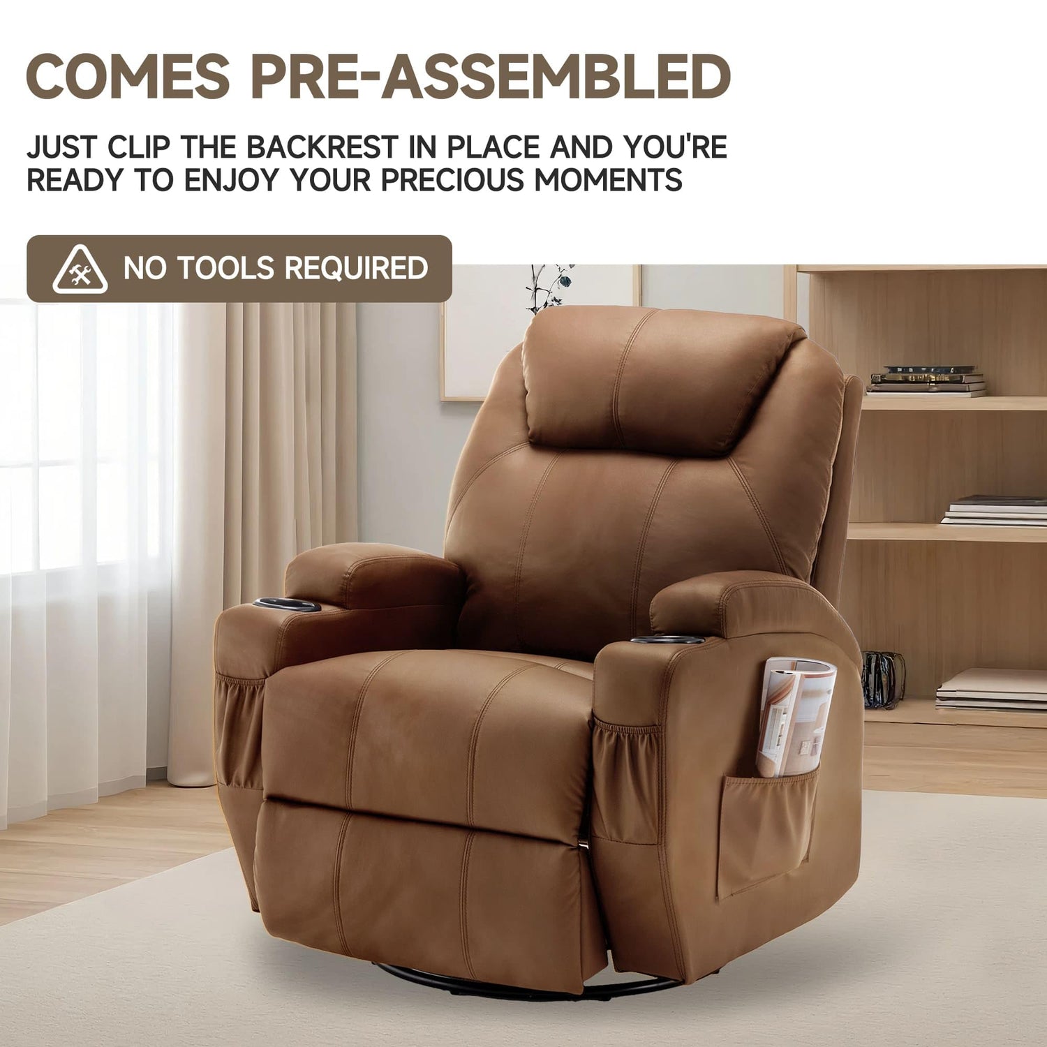 - Superior Material: The Swivel Rocker Recliner is designed with comfort and quality in mind. Made from premium faux leather, which is durable, easy to clean, and water-resistant, the recliner chairs for adult cushions are thick padded with high-density sponges that offer excellent support while sitting. The high-resilience sponges ensure the reclining chair remains comfortable over time, conforming to your body and providing a cozy seating experience.