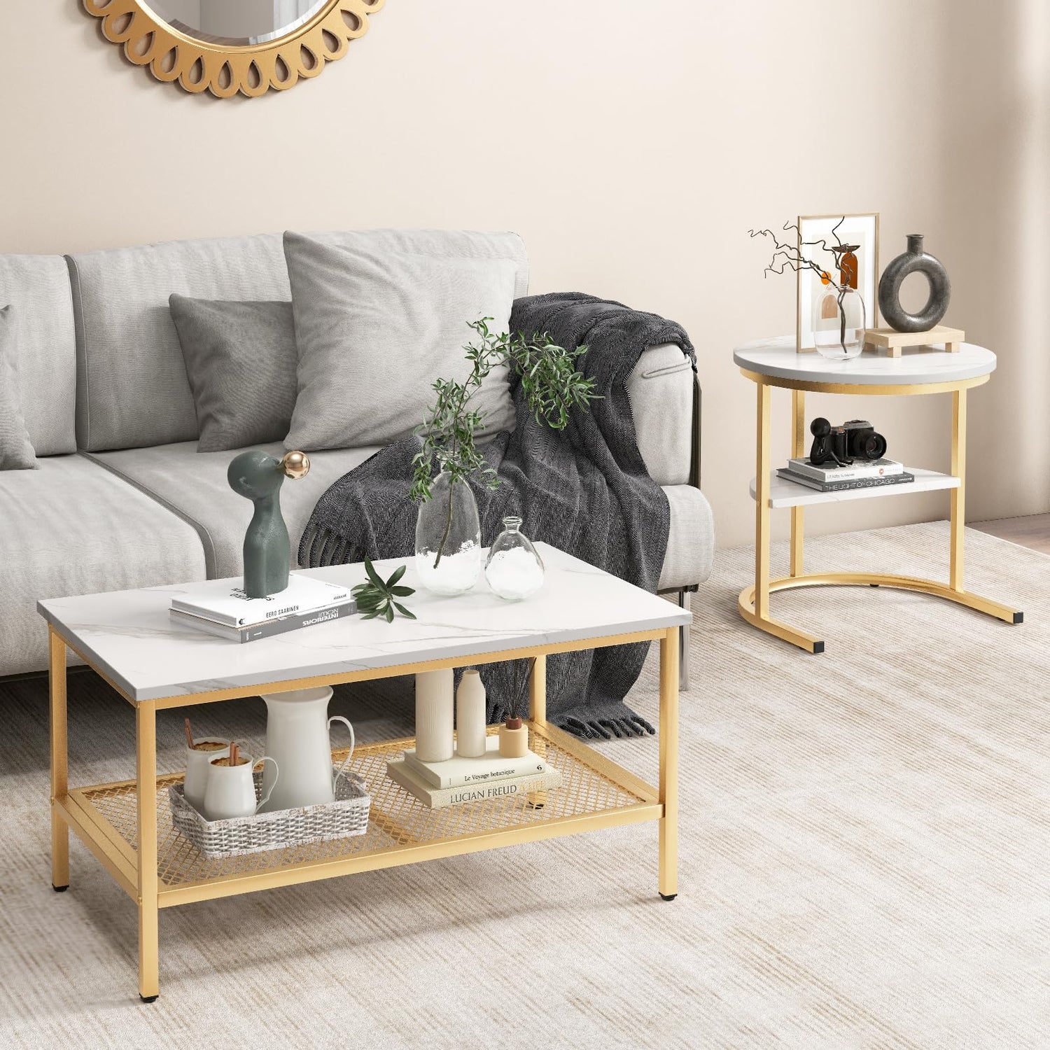 KOTEK Nesting Coffee Table Set of 2, Detachable Rectangular Coffee Table & Small Round End Table Set, Faux Marble Pattern & Sturdy Metal Frame, Modern Nesting Tables for Living Room (Gold)
