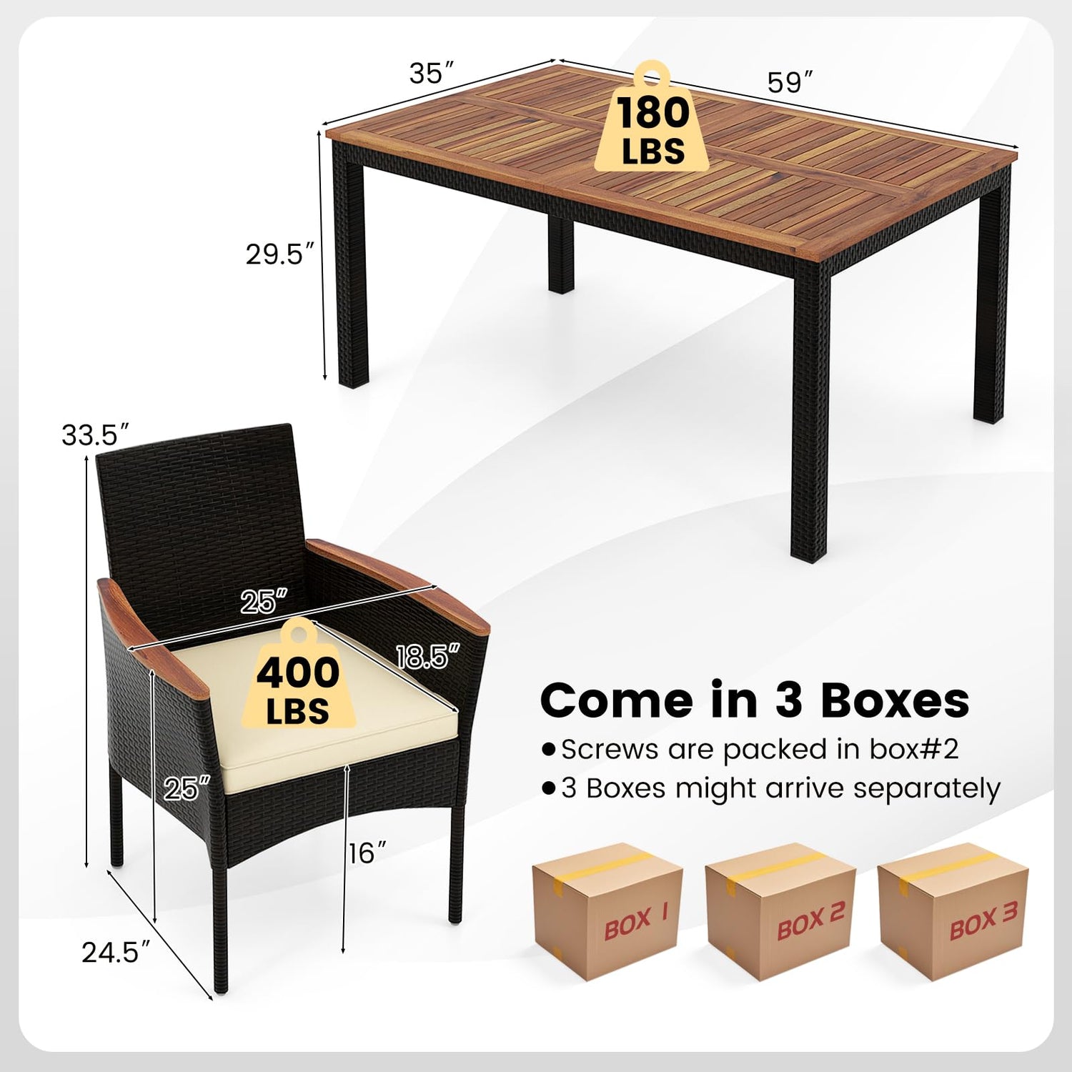 - 【Easy to Assemble & Shipping】With detailed assembly instructions included, this backyard table and chairs set is easy to put together. We will divide into three boxes for you to ship. Please be patient if you only received some of the boxes, they may arrive at different times. If you have any inquiries, please feel free to contact us.