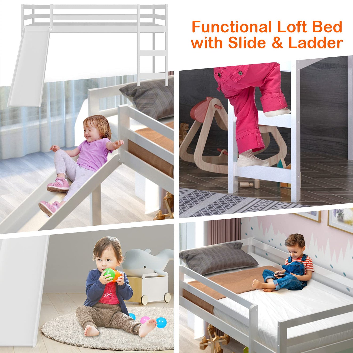 KOTEK Twin Loft Bed with Slide, Kids Low Loft Bed with Ladder & Slide, Wooden Single Bed Loft Bed w/Slats & Safety Guard Rail for Children (White)