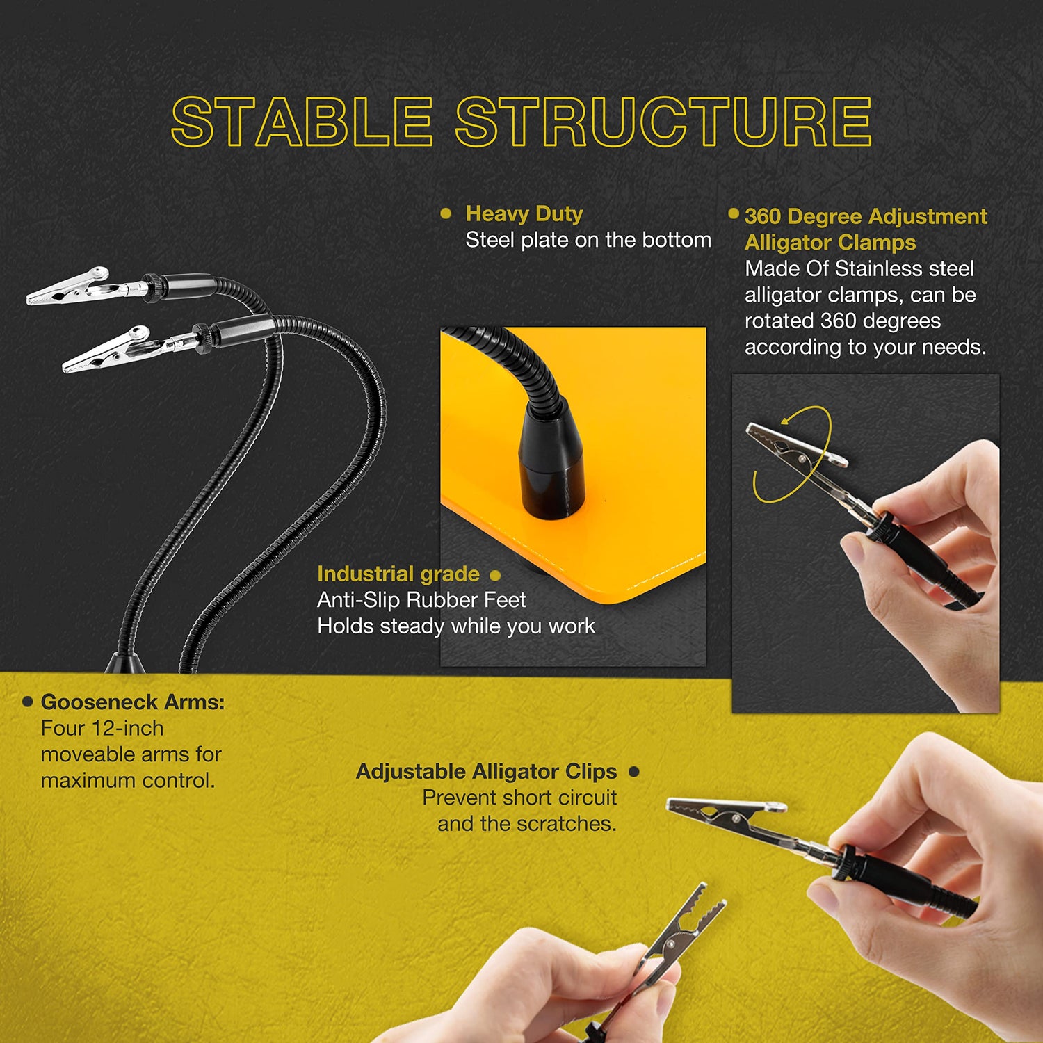 - HOW HAVE YOUR SURVIVED WITHOUT THEM: Our third hand/helping hands soldering stand is essential for every workshop, solder station, and craft room. Ideal for soldering, circuit board holding, assembly, repair, fishing lure, hobby, jewelry, and crafts. 4 adjustable metal gooseneck arms and stainless steel precision alligator clamp tips. 360-degree rotation. The tight grips are strong enough for you to position your hard-to-hold items freely.
