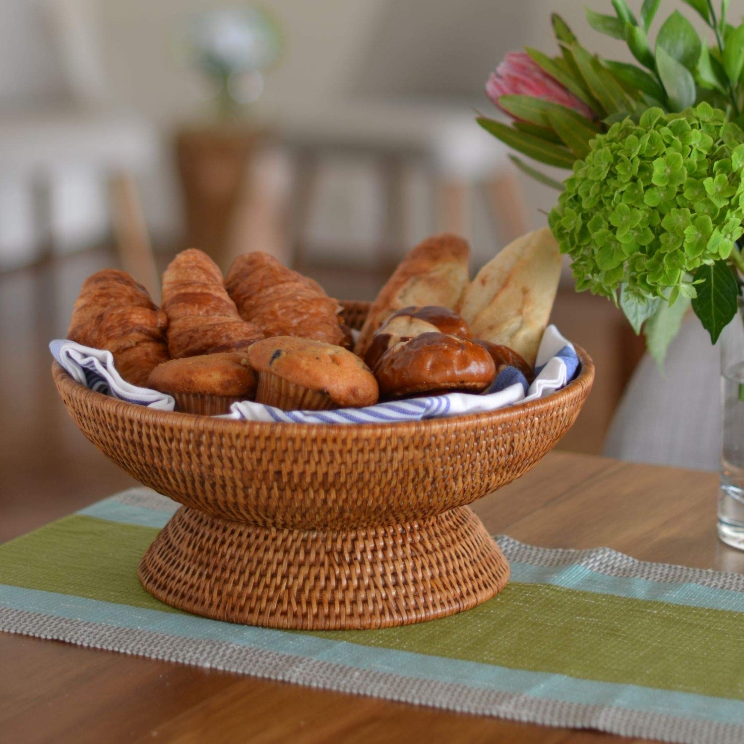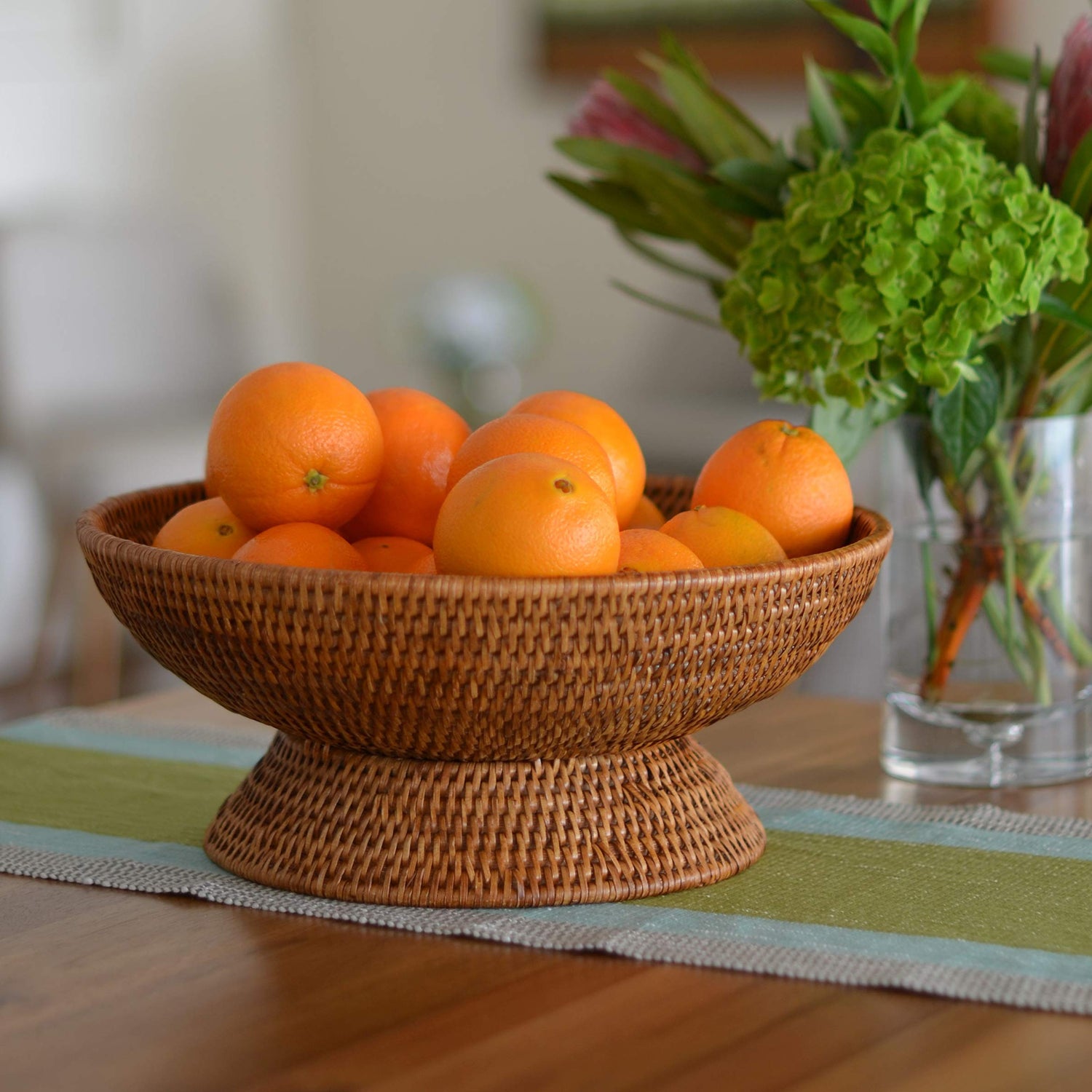 Details: The La Jolla large rattan pedestal fruit bowl complements whatever table or counter you display it on! Fill it with fruit on a kitchen island; use it for creating a centerpiece on your table; or even use it as a "catch all" for keys and mail in your foyer. The honey brown color is a natural with most if not all color palettes.