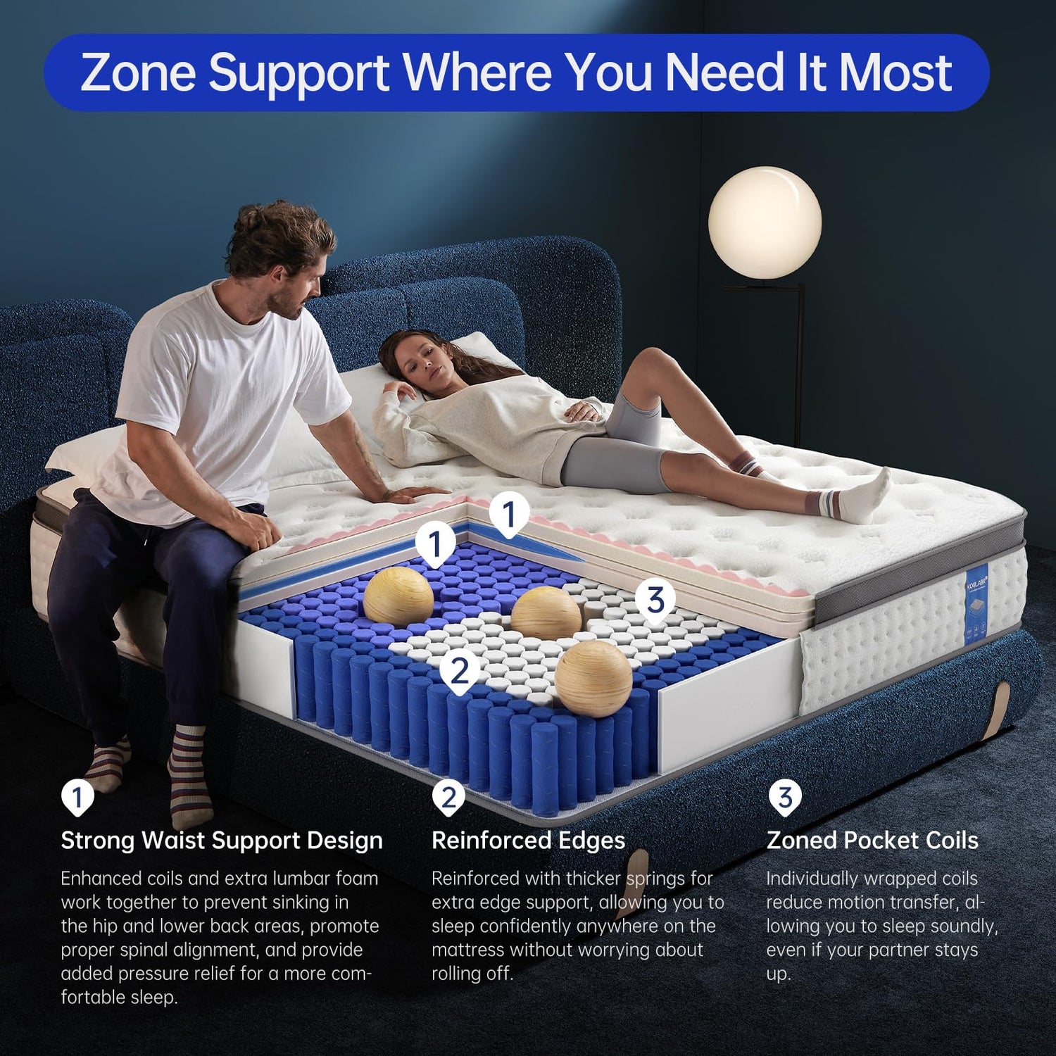 - SUPPORT WHERE YOU NEED IT MOST(ZONE SUPPORT):Enhanced coils and extra lumbar foam work together to prevent sinking in the hip and lower back areas, promote better spinal alignment, and provide added pressure relief. Experience reduced back pain every night.