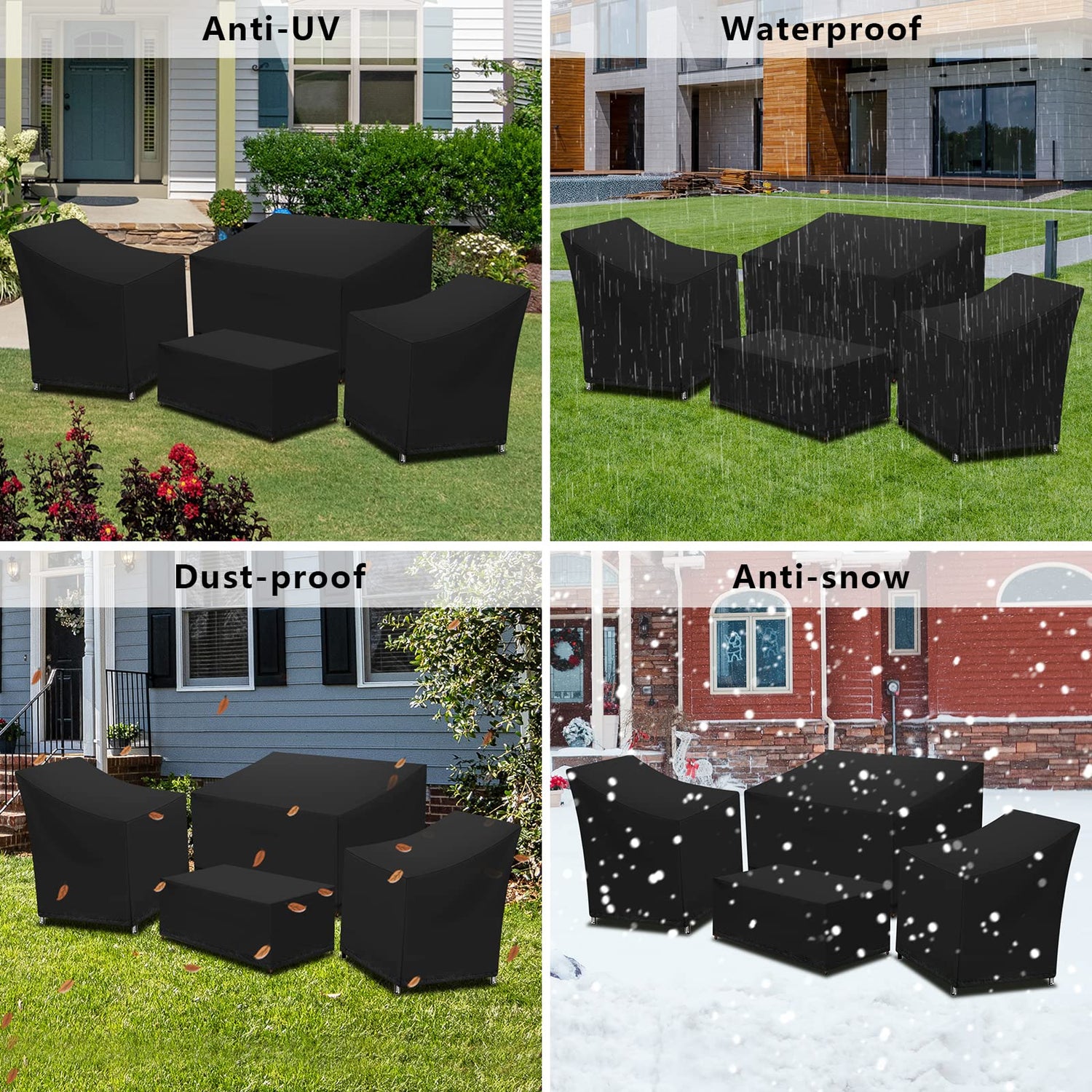 - 【Heavy-Duty Waterproof Material】-Patio furniture set covers Made from 420D PVC-lined oxford fabric, this heavy-duty Garden furniture cover is waterproof, UV-resistant, tear-resistant and fade-resistant, better protect your furniture from harsh environments such as strong sunshine, rain, snow, dust and more.Added UV-stabilized coating and water repellent coating, so the water will not penetrate, and it can slide off quickly, keep a dry surface.
