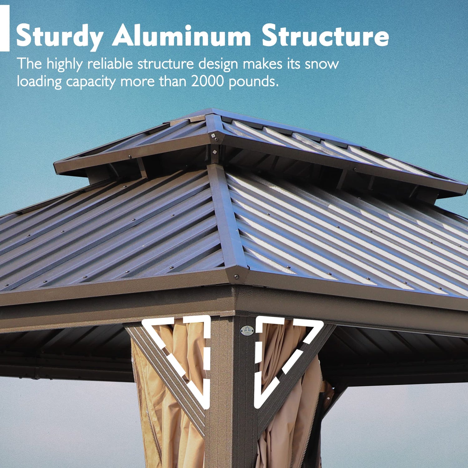 - Double Roof Gazebo- The double roof design allows for proper airflow while still protecting against unwanted elements. Plus, the slope of the roof helps rain and snow to flow down and off the structure, reducing the risk of damage and ensuring a long-lasting, durable roof. Its roof, made of sheet metal, boasts a robust 29-gauge thickness, which is thicker than most gazebos on the market.