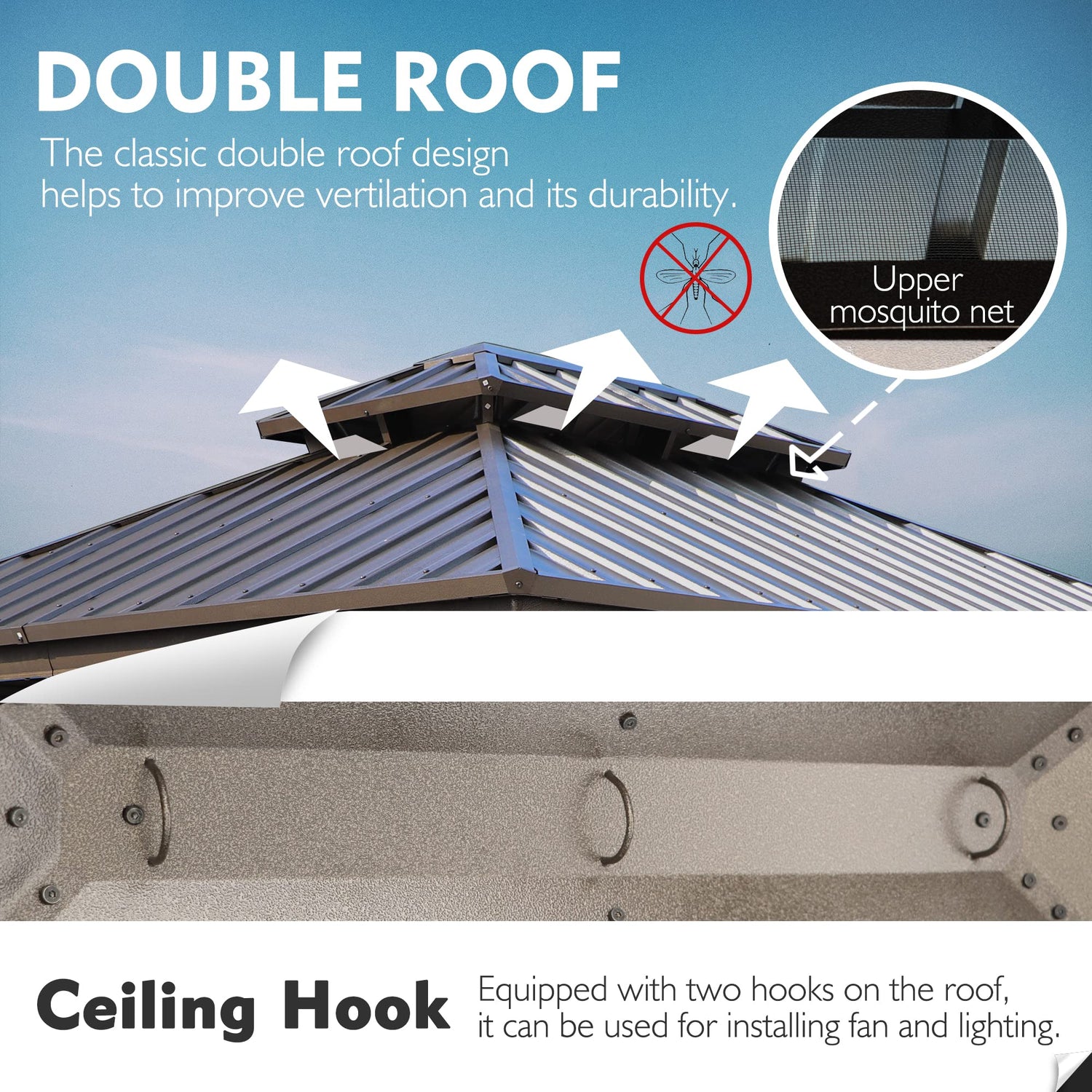 - Double Roof Gazebo- The double roof design allows for proper airflow while still protecting against unwanted elements. Plus, the slope of the roof helps rain and snow to flow down and off the structure, reducing the risk of damage and ensuring a long-lasting, durable roof. Its roof, made of sheet metal, boasts a robust 29-gauge thickness, which is thicker than most gazebos on the market.