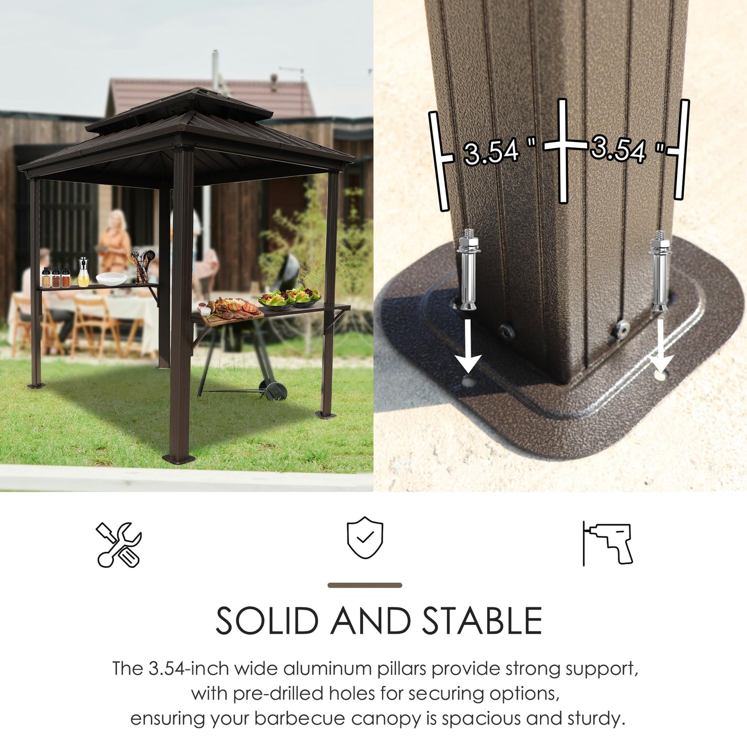 Kozyard 6’ x 8’ BBQ Hardtop Grill Gazebo, Outdoor Barbecue Gazebo with Double Galvanized Metal Roof, Aluminum BBQ Gazebo with 2 Side Shelves for Outdoor Grilling Station (Brown/Hardtop)