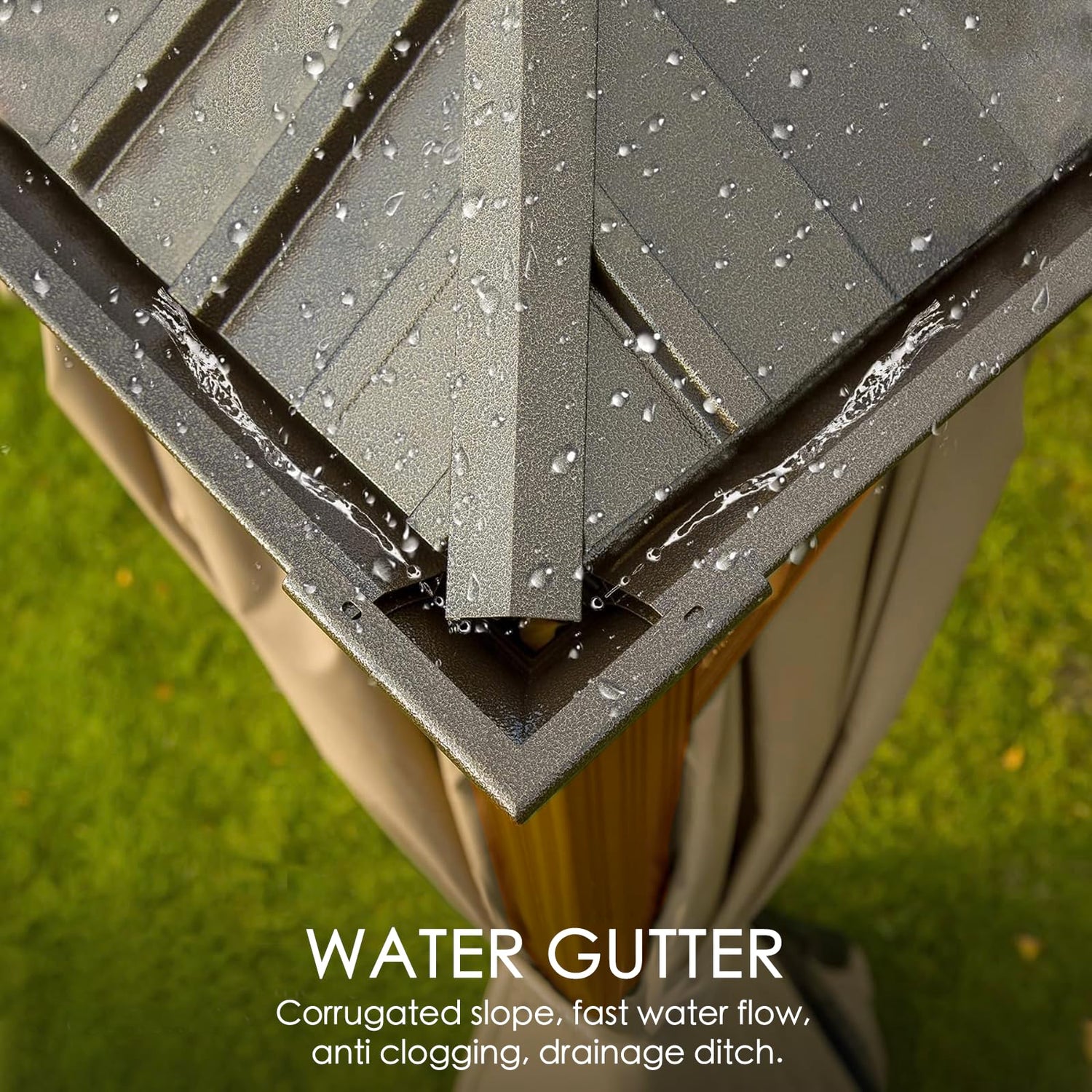 - ✅Metal Canopy/Roof and Gutter Design - The metal canopy of this gazebo ensures longevity and durability. Its roof, made of sheet metal, boasts a robust 29-gauge thickness, which is thicker than most gazebos on the market. its water gutter system ensures that rainwater is efficiently directed away from the edges of the frame and poles.