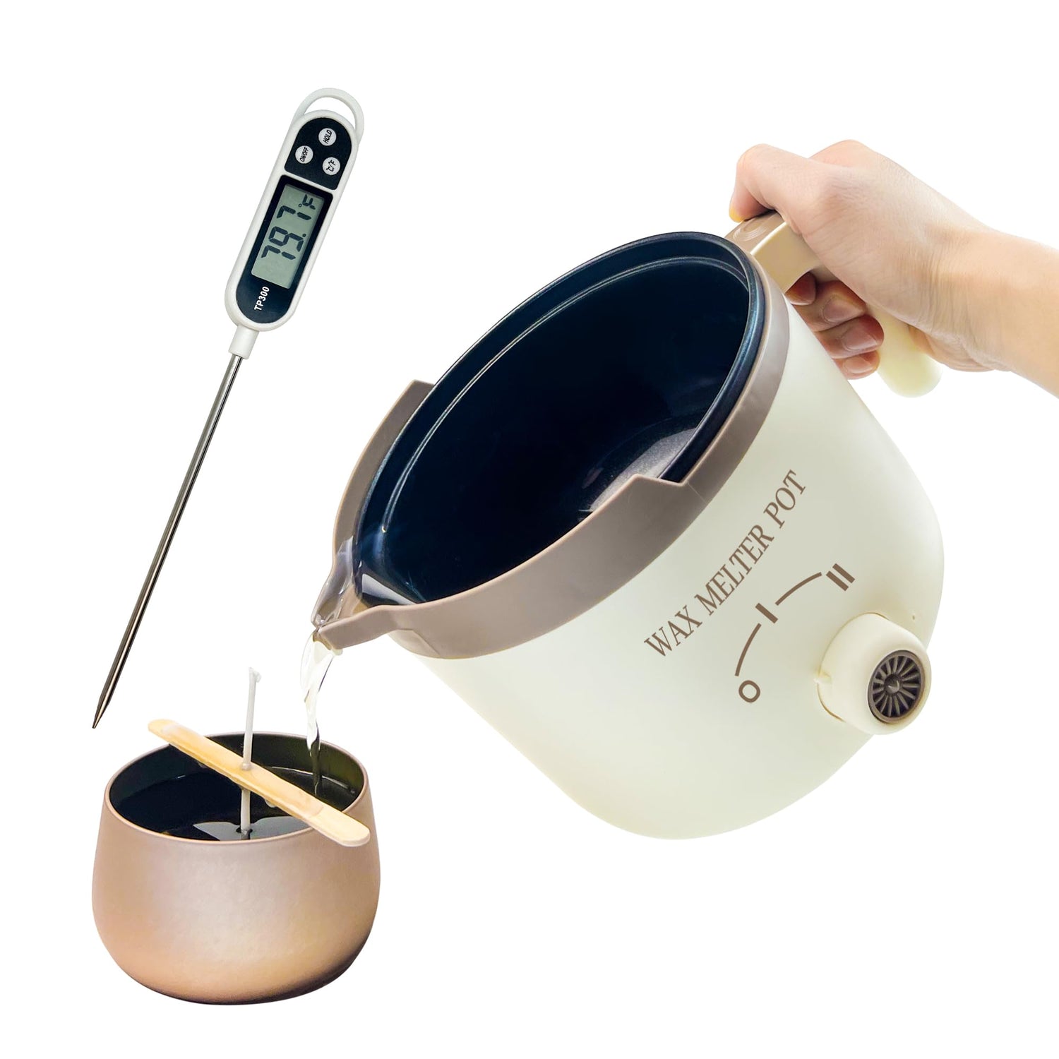 - Candle wax melting pot with thermometer: It requires precision to make beautiful, professional candles. The thermometer for the wax melting pot, helping you to control the acual temp for the wax in the pot, here, we suggested the fix spot to get the precise temp in the wax, do not keep move the the thermometer all time.