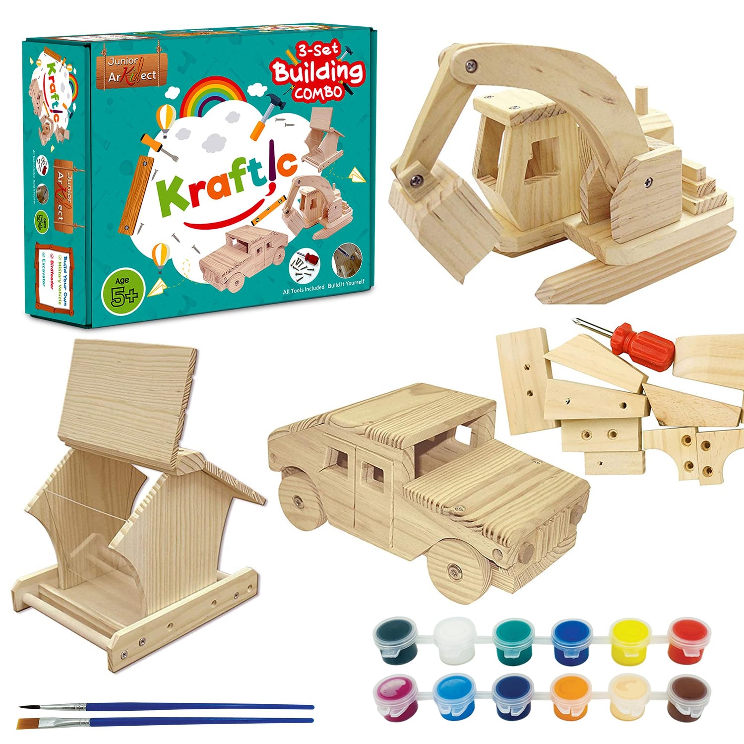 Kraftic Woodworking Building Kit for Kids and Adults, 3 Educational DIY Carpentry Construction Wood Model Kit STEM Toy Projects for Boys and Girls - Wooden Military Vehicle, Excavator and Bird-Feeder