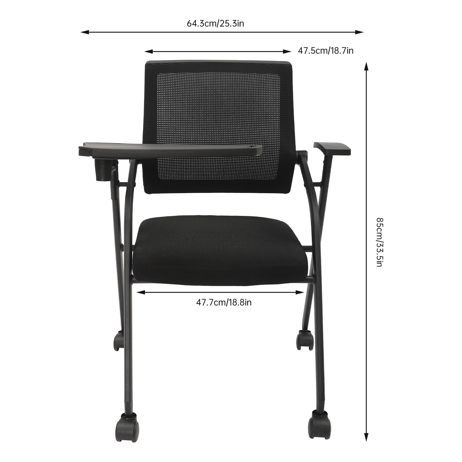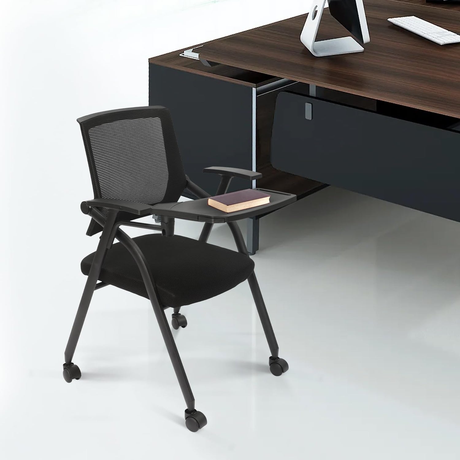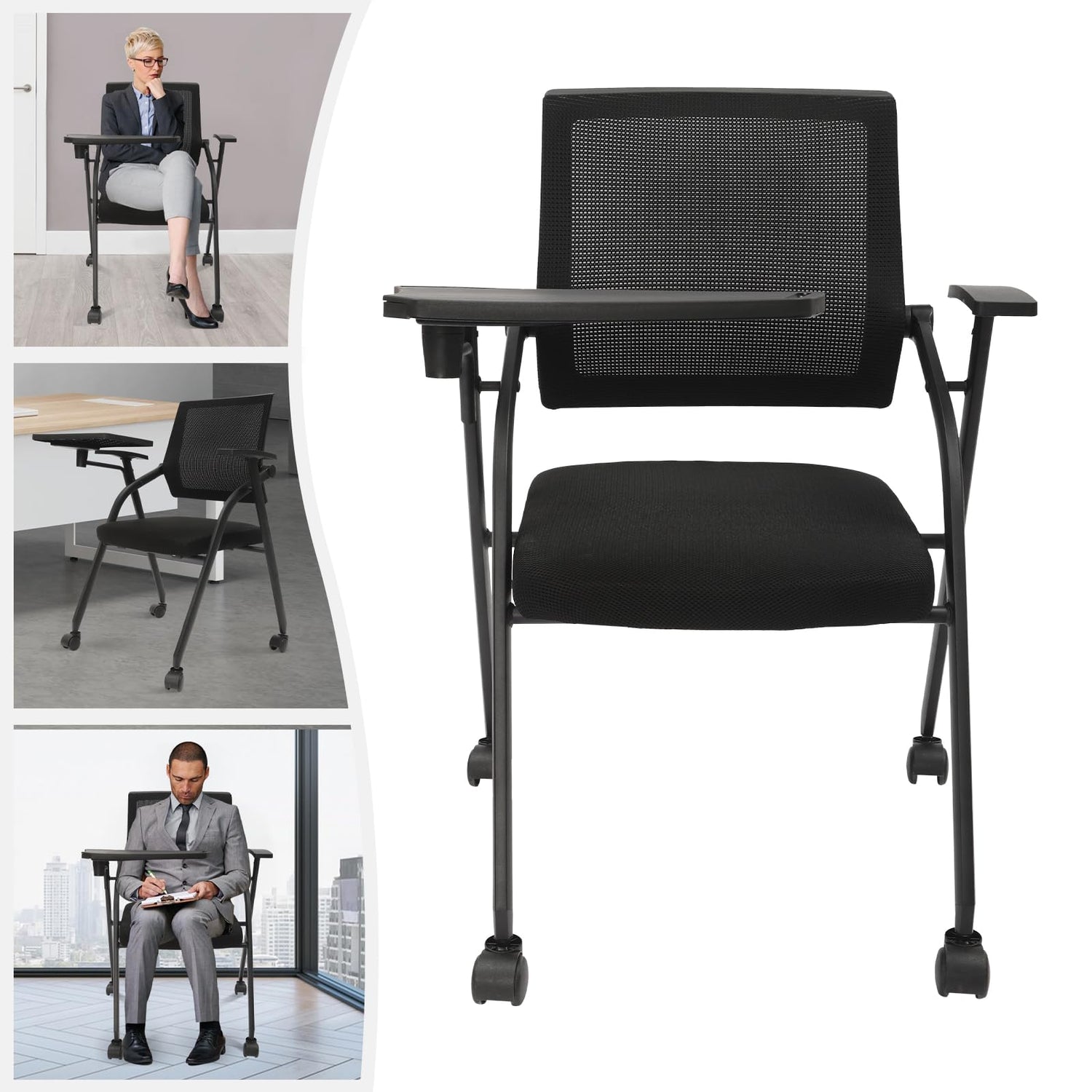 Kreiaoer Folding Office Chair with Tablet and Caster Wheel, Mesh Guest Reception Chairs with Arm, Rolling Chair for Office, School, Training Conference Waiting Room (Black)