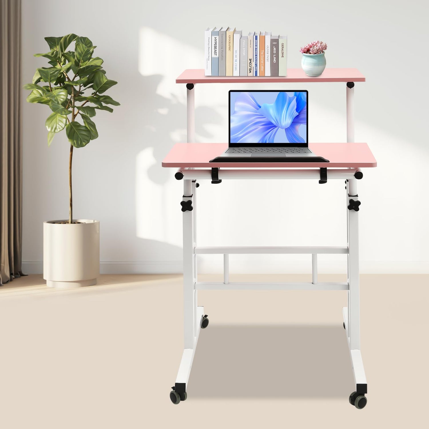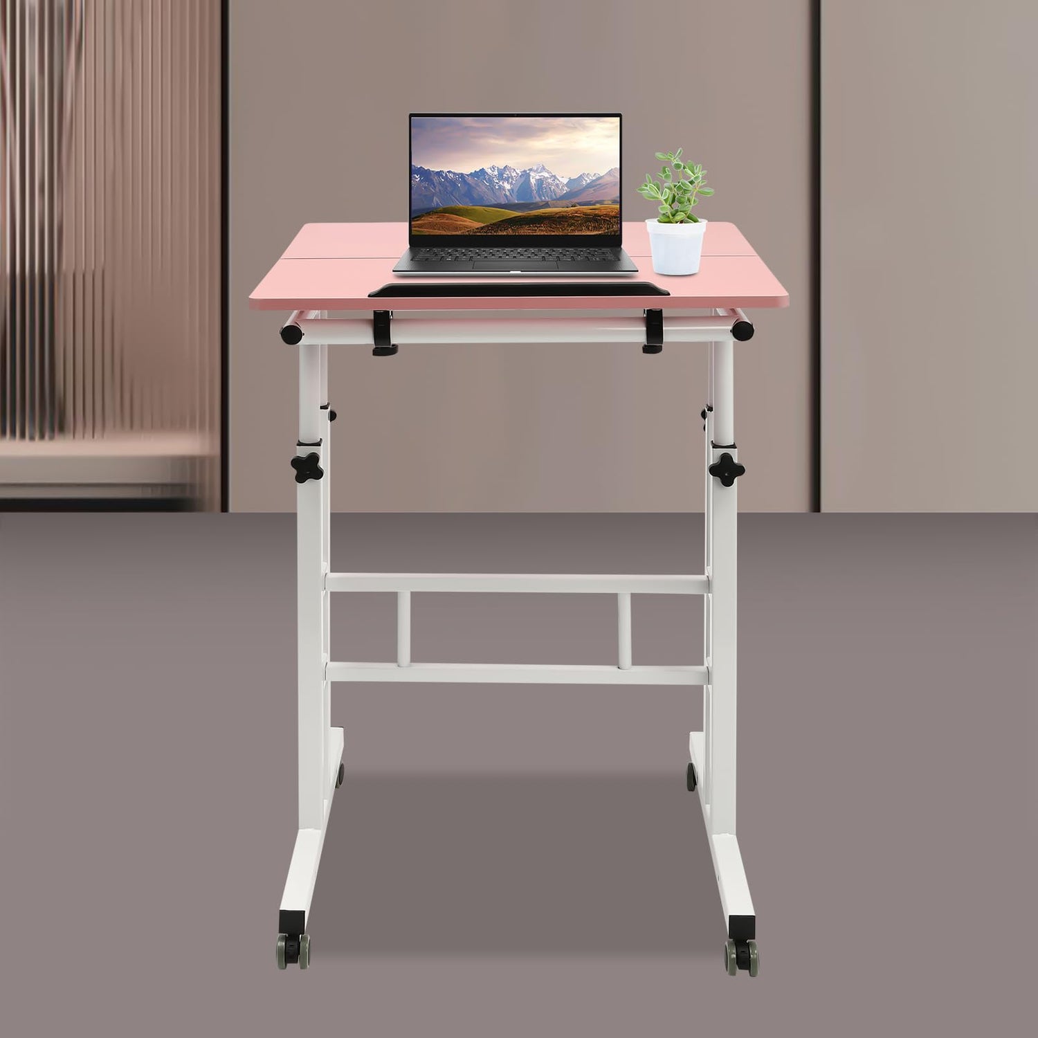 Kreiaoer Height Adjustable Table, Small Adjustable Standing Desk with Wheels Home Office Workstation, Portable Rolling Desk Laptop Cart for Standing or Sitting (Pink)