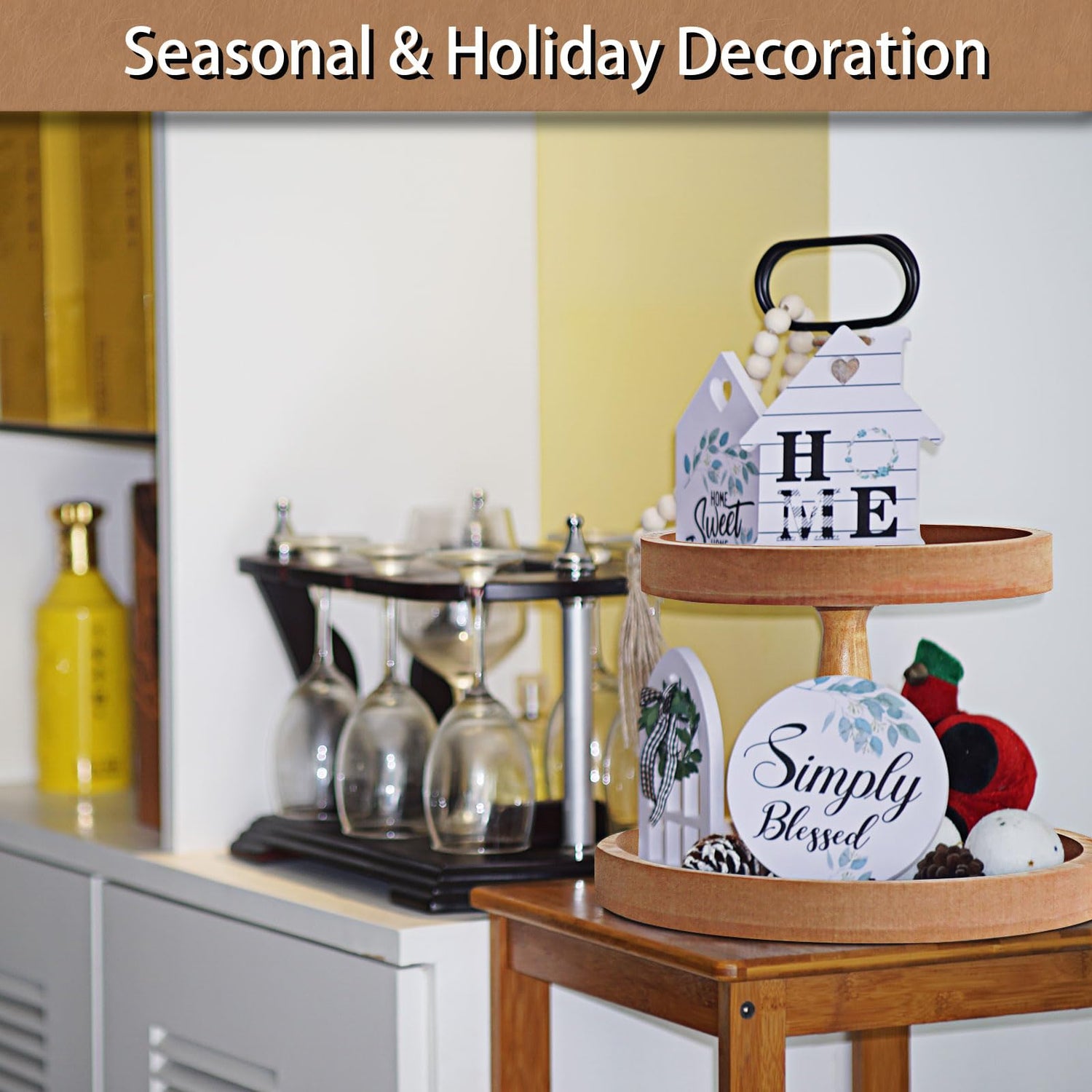 - π DECORATVE TRAY FOR EVERY HOLIDAY:Decorate this 2 tier wood tray for Christmas,Easter,Thanksgiving, Halloween, 4th of July and beyond! This tiered farmhouse tray looks amazing with holiday themed decor items and is a perfect versatile centerpiece that can be decorated for every holiday!