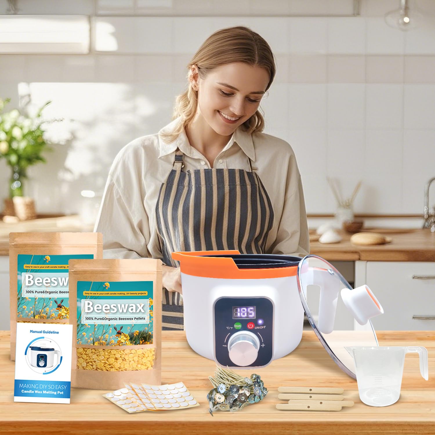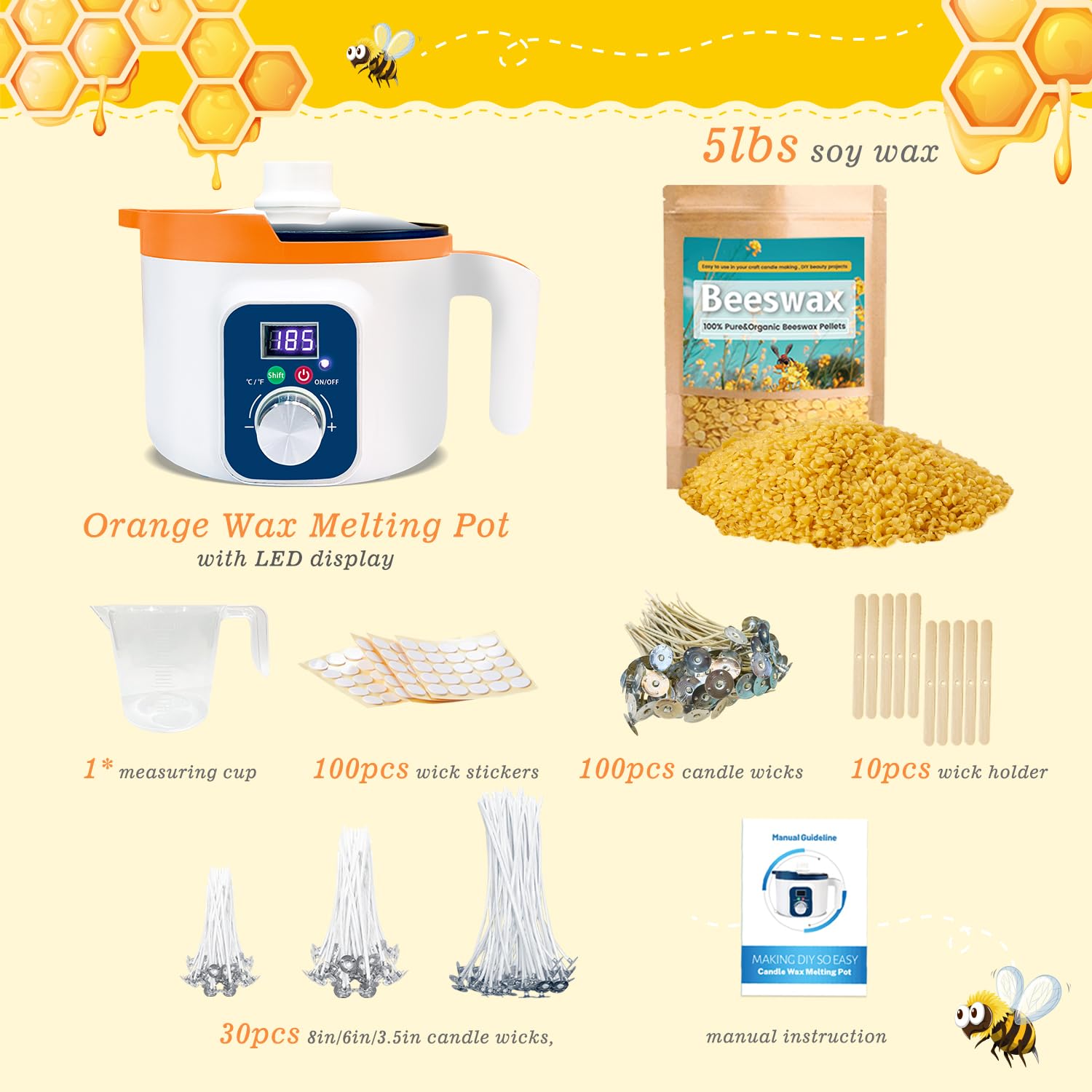 - Beeswax candle kit: Orange Wax Melter with LED Display 1pcs,5lbs natural beeswax,8in candle wicks 30pcs,6in candle wicks 30pcs,3.5in candle wicks 30pcs,beeswax wicks 30pcs,wick stickers 100pcs,wick holder 10pcs,measuring cup 1pcs,manual instruction 1pcs.Includes Everything you need to make your own candles.