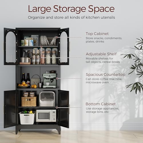 Kubohogar 75" Tall Kitchen Pantry Cabinet, Metal Storage Cabinets with Acrylic Doors and Adjustable Shelves, Hutch Cabinet with Storage, Black Microwave Stand Cabinets for Dining Living Room