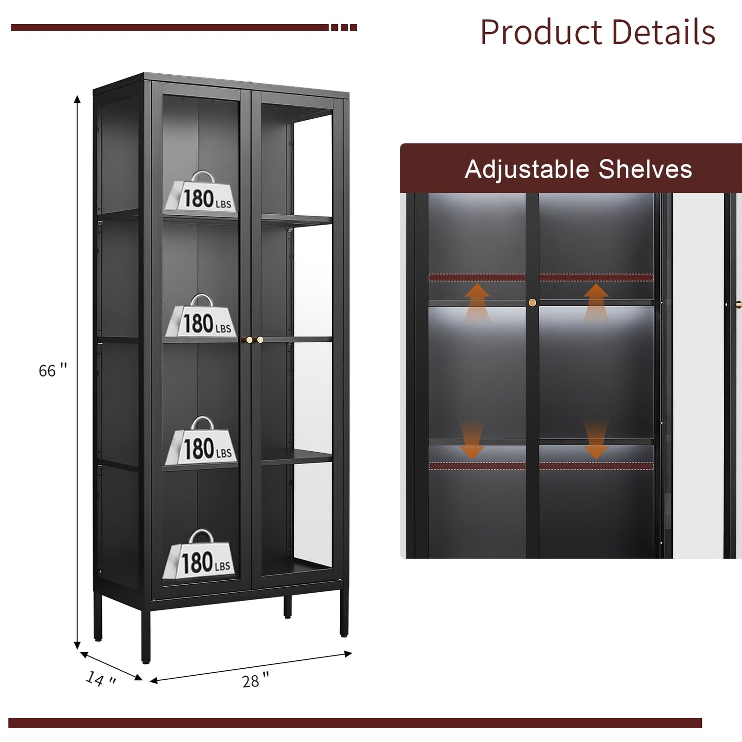 - AMPLE STORAGE SPACE: Glass cabinet size: 66"H x 28"W x 14"D. The lighted display cabinet has three adjustable height shelves, each shelf bearing 180LBS, you can adjust the height according to your storage needs. Curio cabinet is suitable for study, living room, dining room, gaming room