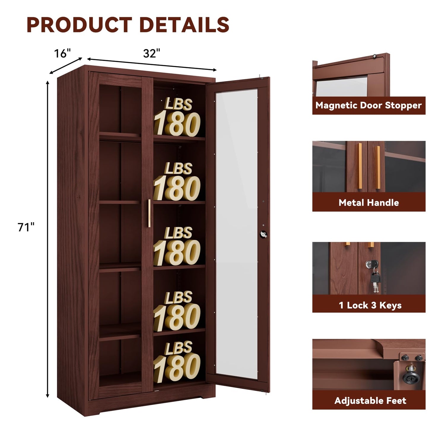 Kubohogar Display Cabinet with Glass Doors,71" Metal Curio Cabinets with 4 Adjustable Shelves, 5 Tier Display Case for Collectibles, Metal Storage Cabinet, Brown