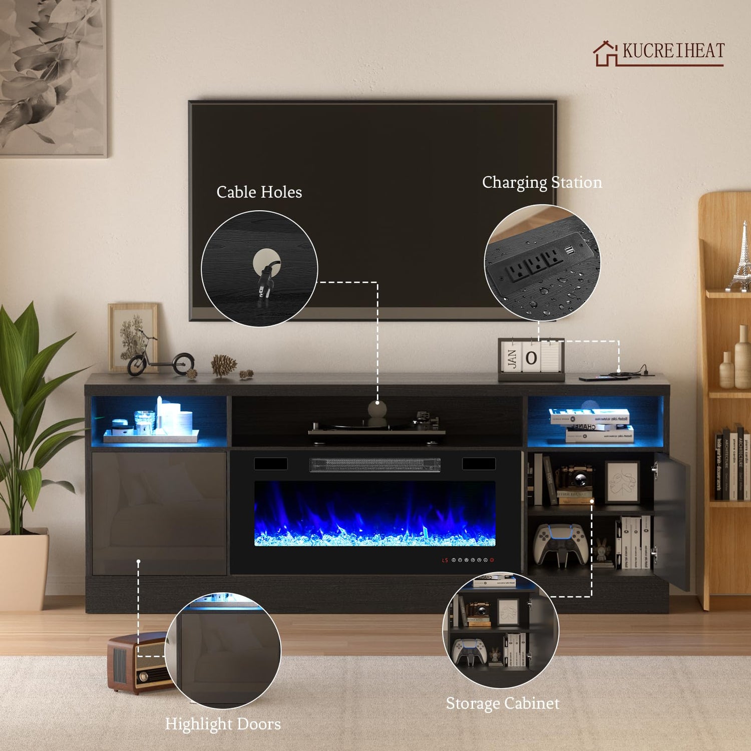 Kucreiheat 70'' TV Stand with 36'' Fireplace-LED Light Entertainment Center for 75+ inch TV-Black TV Cabinet with Storage, Modern TV Console for Living Room