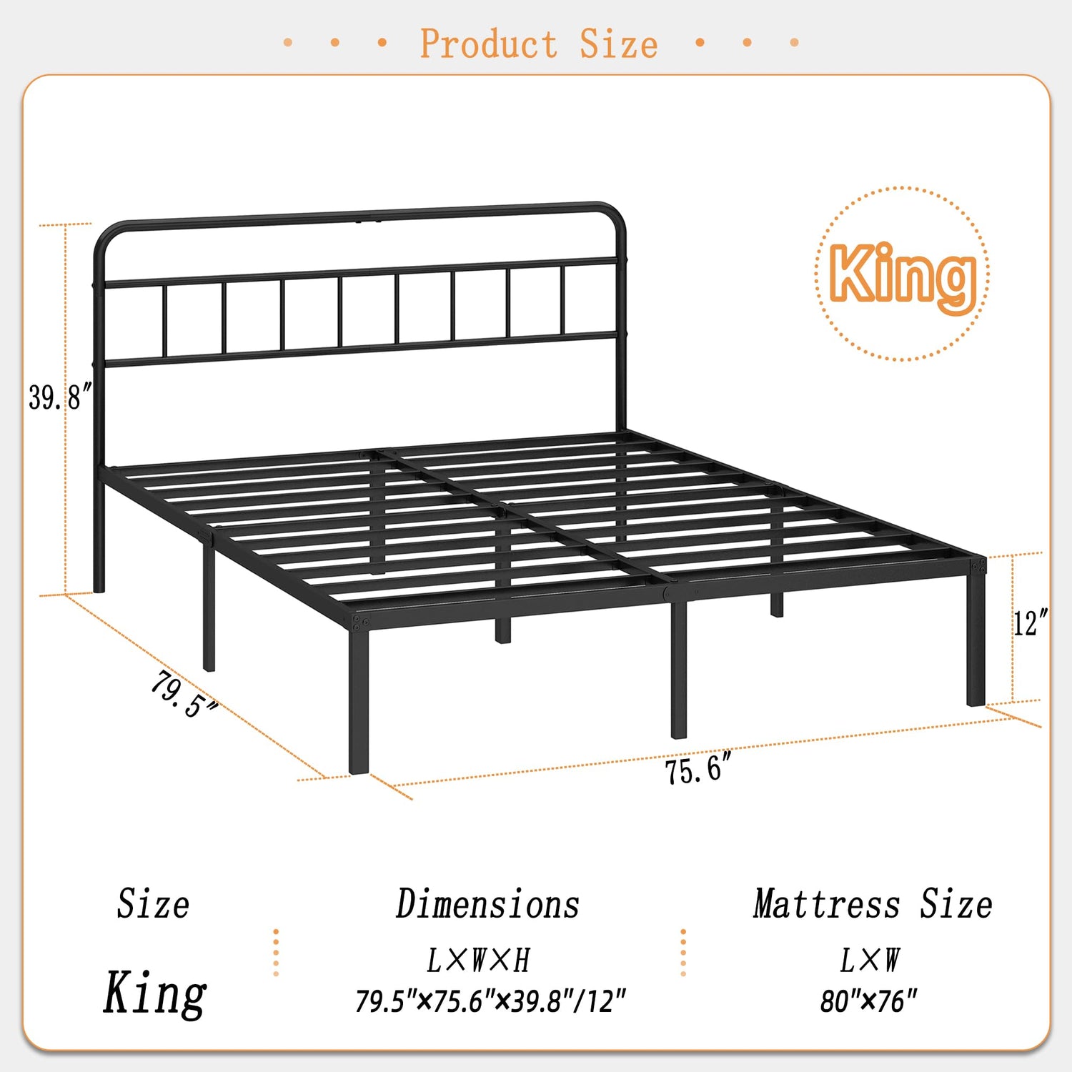 Kujielan 12 inches King Size Bed Frame with Minimalist headboard,Metal Platform Base with Strong Metal Slats,Mattress Foundation for Under Bed Storage,Easy Assembly,Black