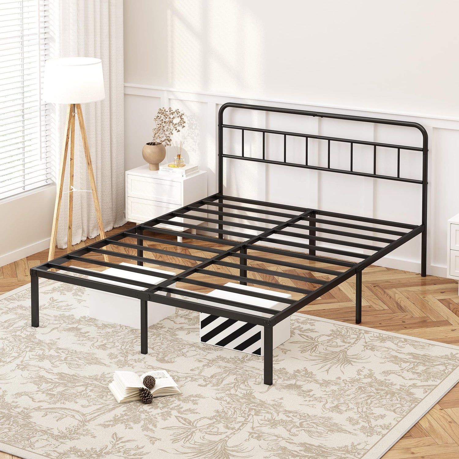 - No Box Spring Needed:Designed with a supportive slatted base, the queen bed frame eliminates the need for a box spring. The slats are spaced optimally to prevent mattress sagging while providing proper ventilation, which can extend the lifespan of your mattress and offer better sleep comfort.