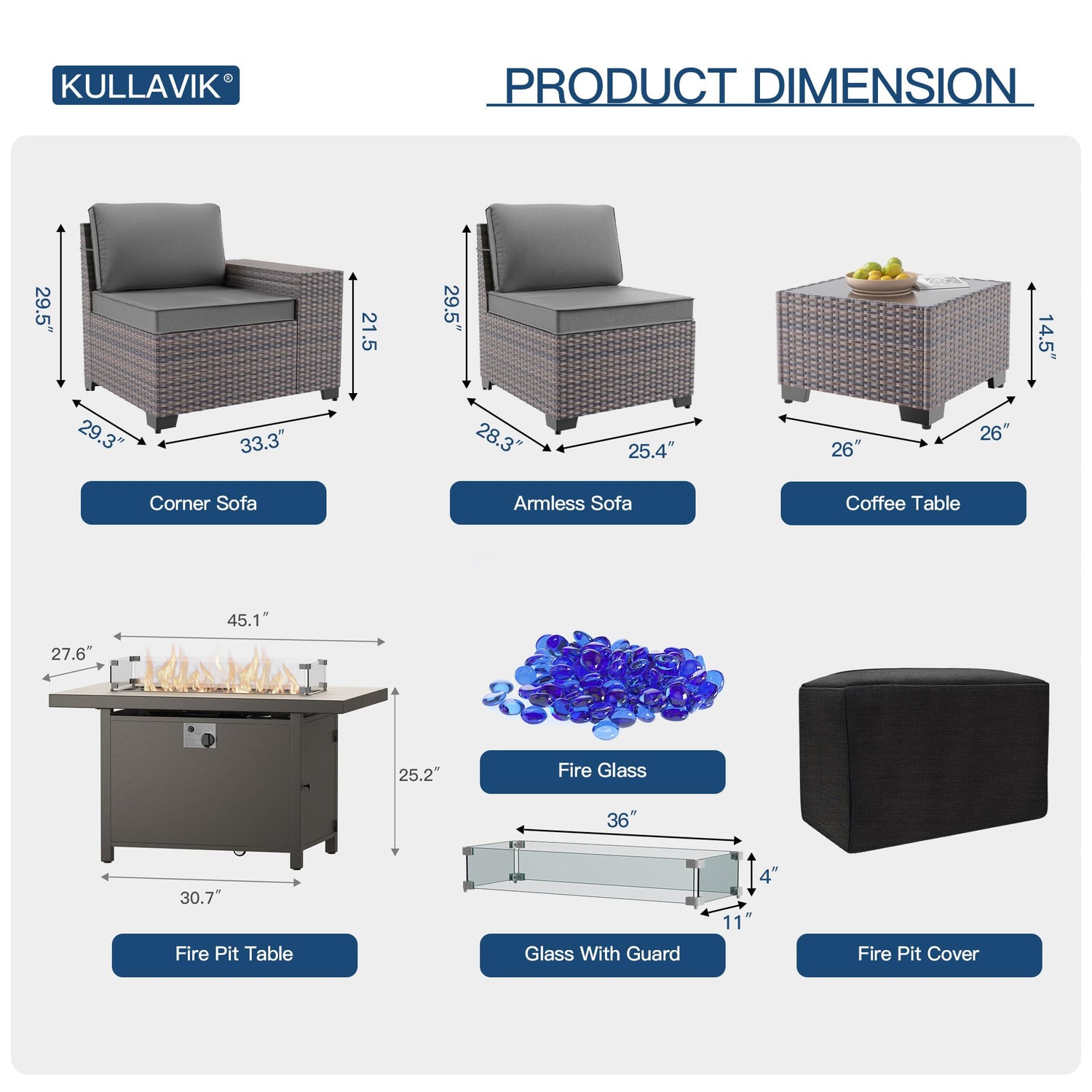- Combination Flexibility:The Kulavik outdoor patio furniture set includes a 3 pieces swivel chairs set,2 middle sofas,1 corner sofa,1 left sofa and 1 right sofa,a coffee table,a aluminum fire pit table.Whether it's a balcony,poolside or lawn,they all blend in perfectly at will,allowing you to create an outdoor meeting area that is both functional and beautiful as you wish.