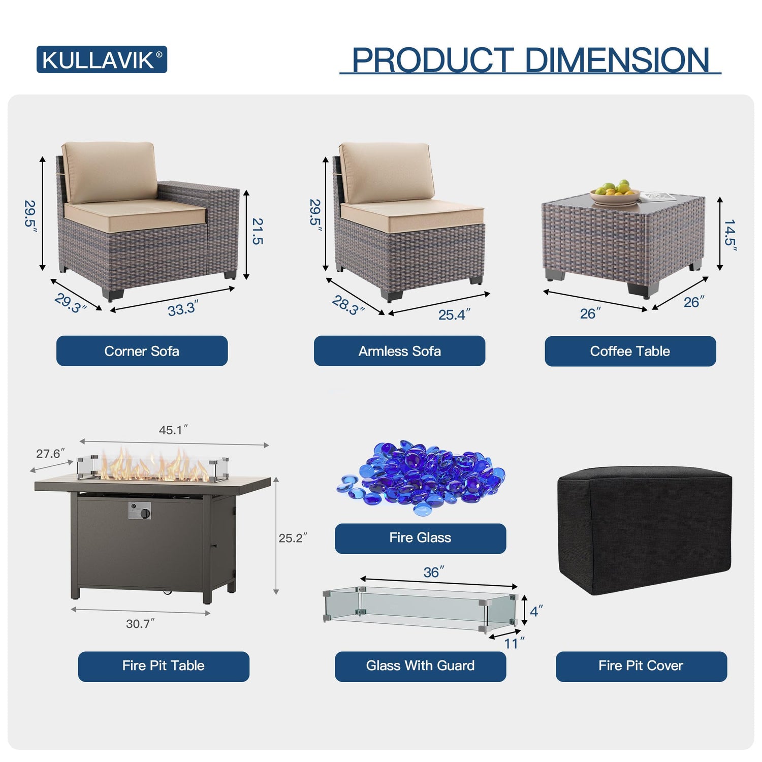 - Combination Flexibility:The Kulavik outdoor patio furniture set includes a 3 pieces swivel chairs set,2 middle sofas,1 corner sofa,1 left sofa and 1 right sofa,a coffee table,a aluminum fire pit table.Whether it's a balcony,poolside or lawn,they all blend in perfectly at will,allowing you to create an outdoor meeting area that is both functional and beautiful as you wish.