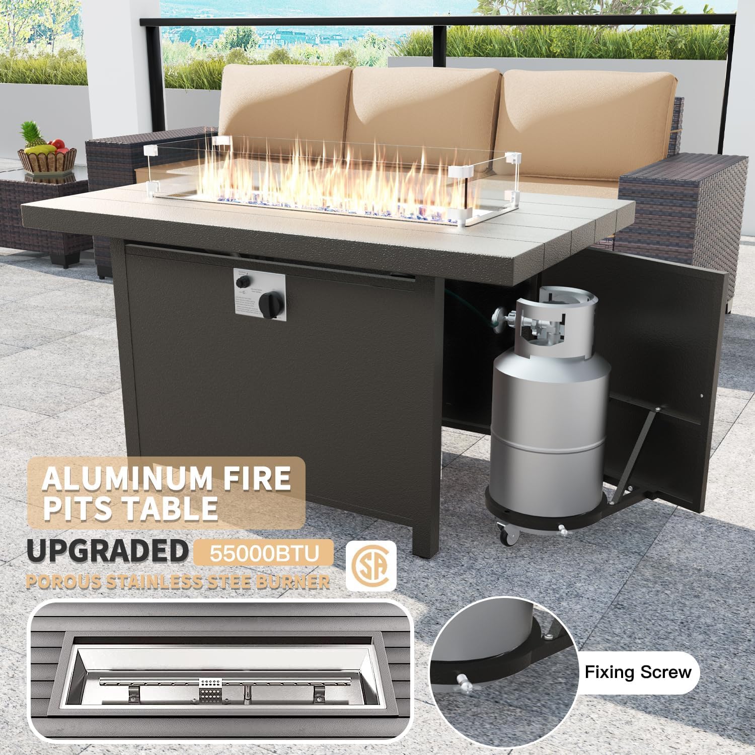 - Long-lasting Warmth:The fire pit table has an upgraded dual tube burner with one-touch ignition for quick startup and a heat output of 55000 BTU when lit to maintain a steady and full burn.Propane fuel allows you to stop suffering from ash and smoke.