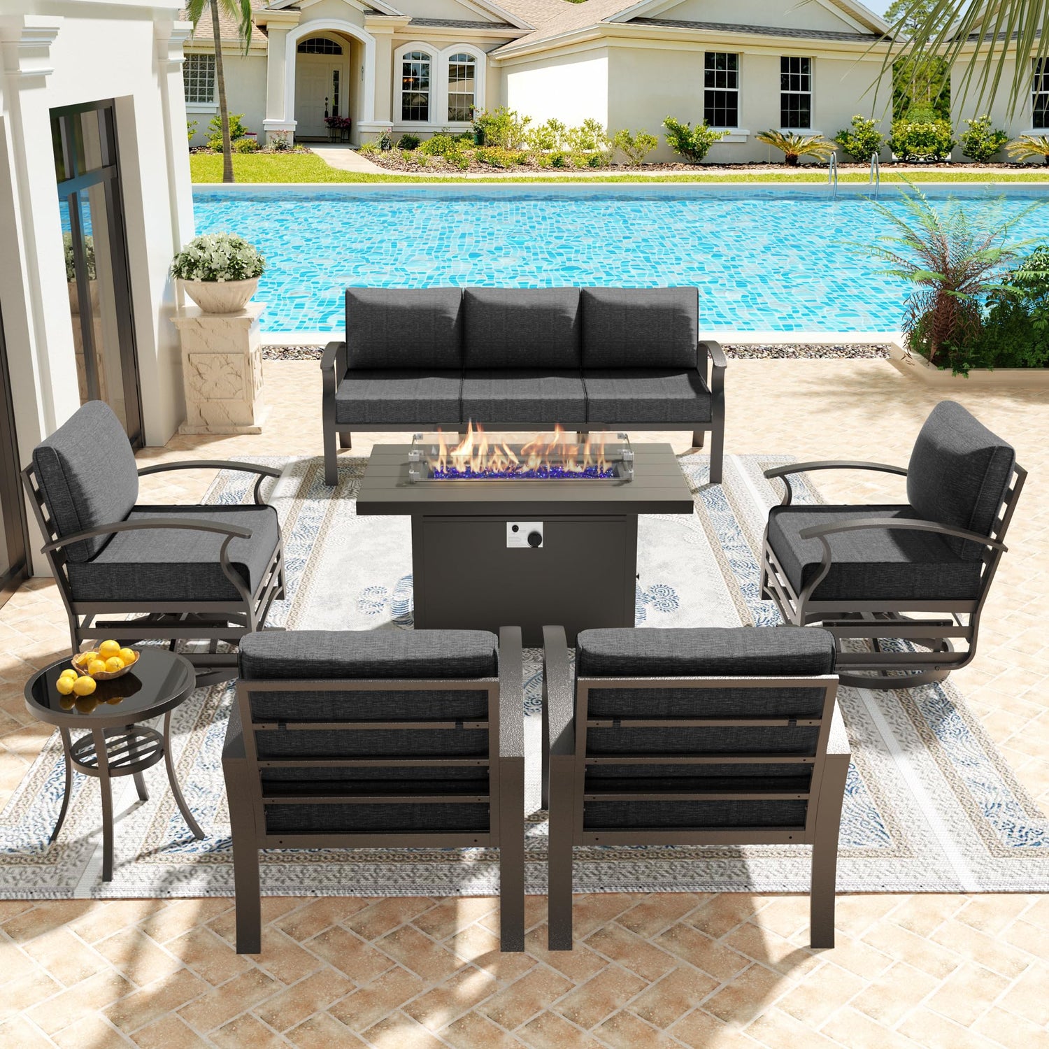 - Package Set:Aluminum patio furniture set includes 2 Swivel Chairs,1 Coffee Table,1 3-Seater Sofa,2 Single Sofas,and 1 Fire Pit Table.We also provide matching cushions for the sofas and instruction manual for the patio set.