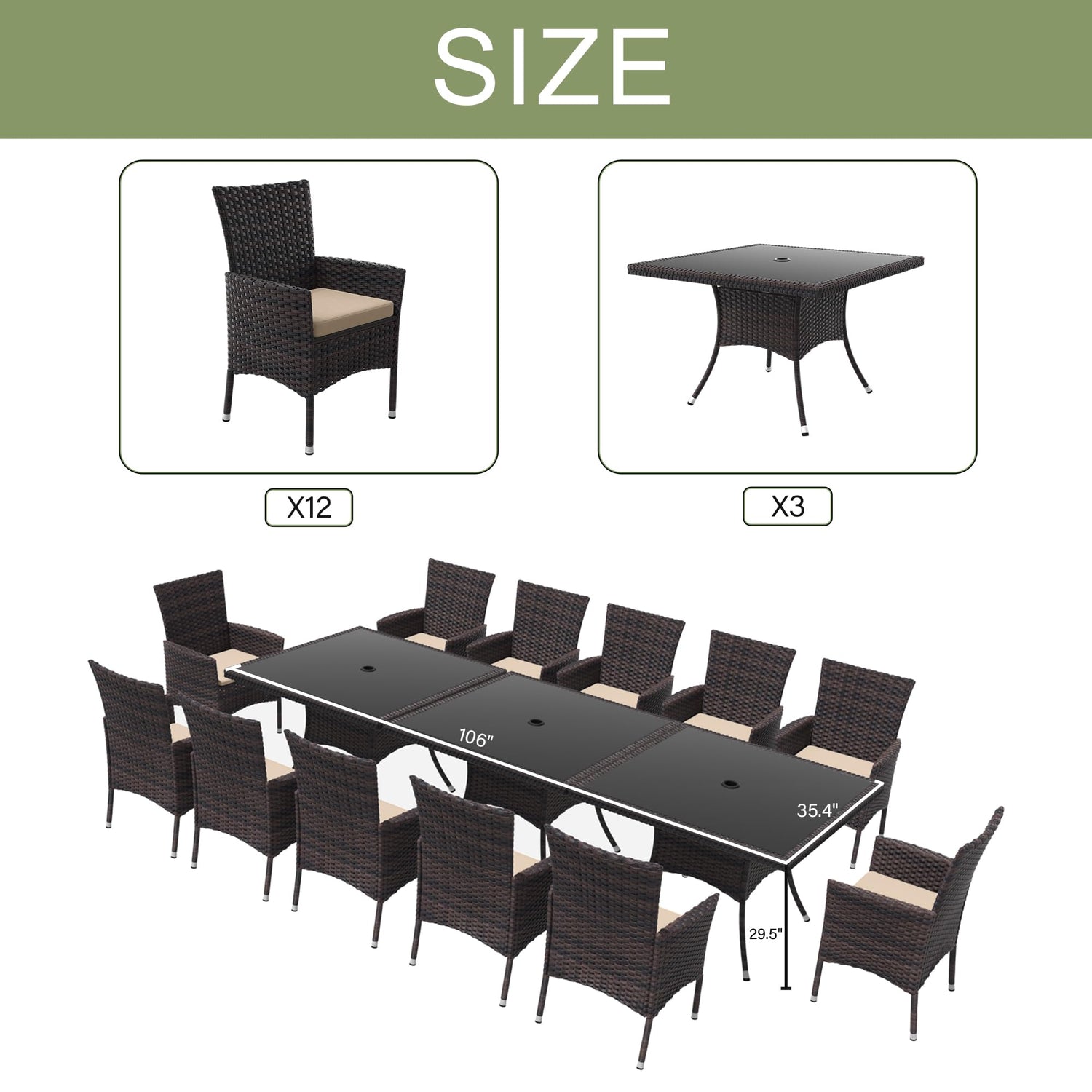 Kurapika 15-Piece Patio Furniture Outdoor Dining Set, Wicker Rattan Table and Chairs, Square Tempered Glass Tabletop With Umbrella Hole, 12 Chairs, Sand