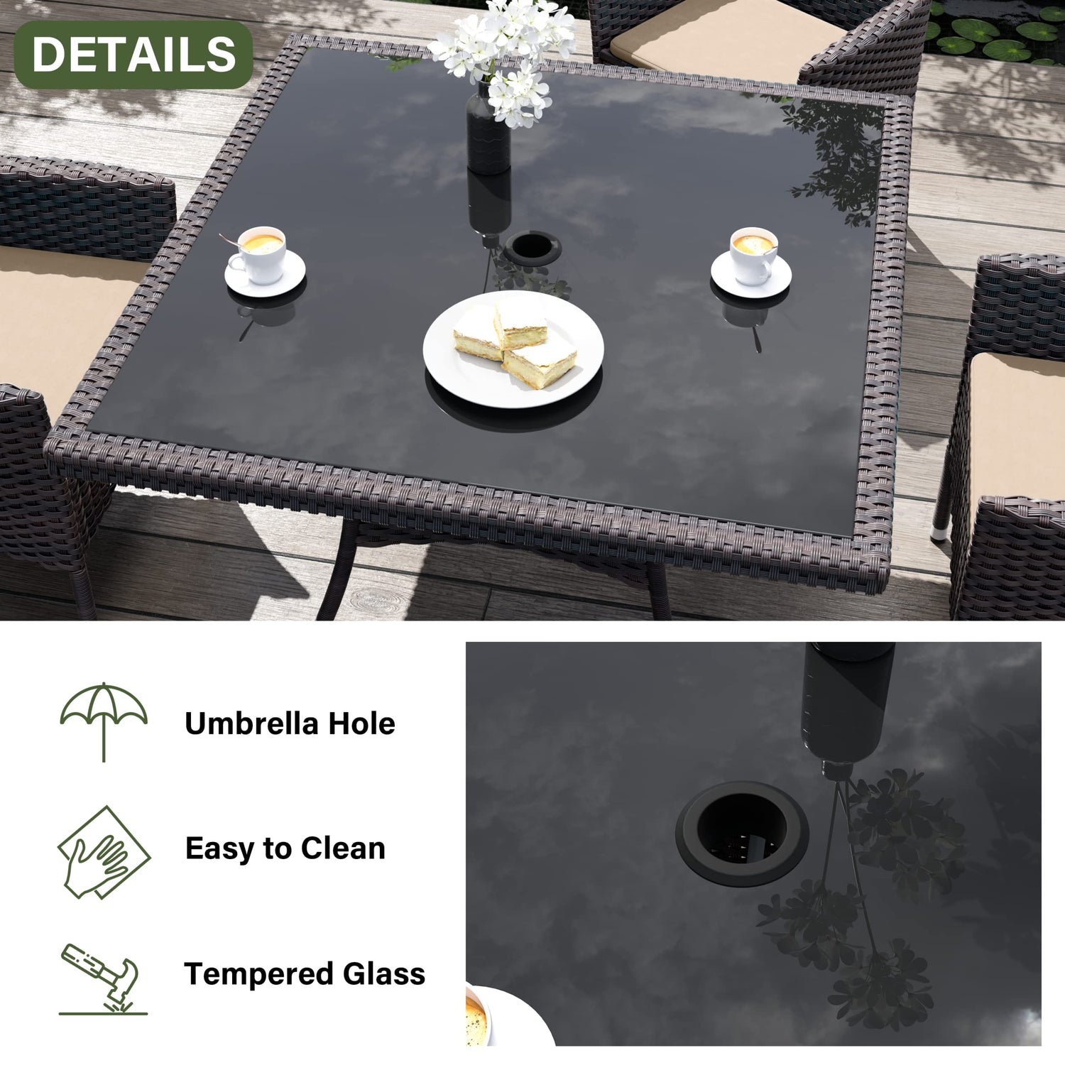 - Tempered Glass Tabletop: The dining table is made of high-quality tempered glass and equipped with a glass protection pad on the bottom, which is more wear-resistant than ordinary glass and easy to clean. The center of the glass is left with a 1.5-inch umbrella hole for a parasol, allowing you to enjoy a shady outdoor dining environment even on hot summer days