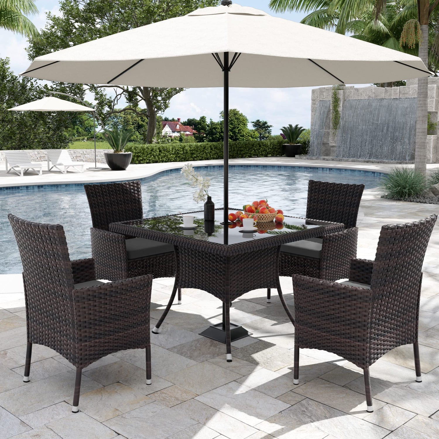 Kurapika 5-Piece Patio Furniture Outdoor Dining Set, Wicker Rattan Patio Dining Table and 4 Chairs Set, Square Tempered Glass Tabletop with Umbrella Hole, for Patio, Backyard, Grey