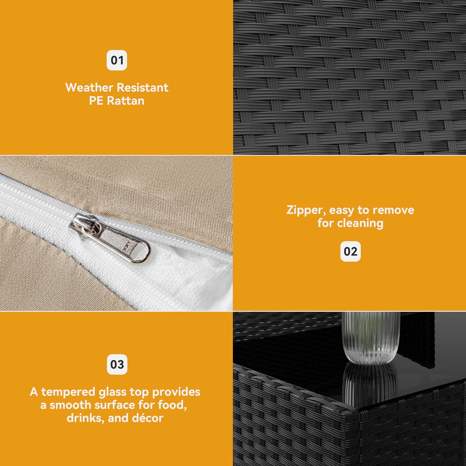 - Premium Materials: The 4-piece outdoor furniture set is composed of a sturdy powder-coated steel frame and hand-woven PE rattan, which can effectively improve overall stability and durability. The covered rattan is hand-woven by experienced craftsmen for a comfortable and smooth touch, suitable for all-weather use