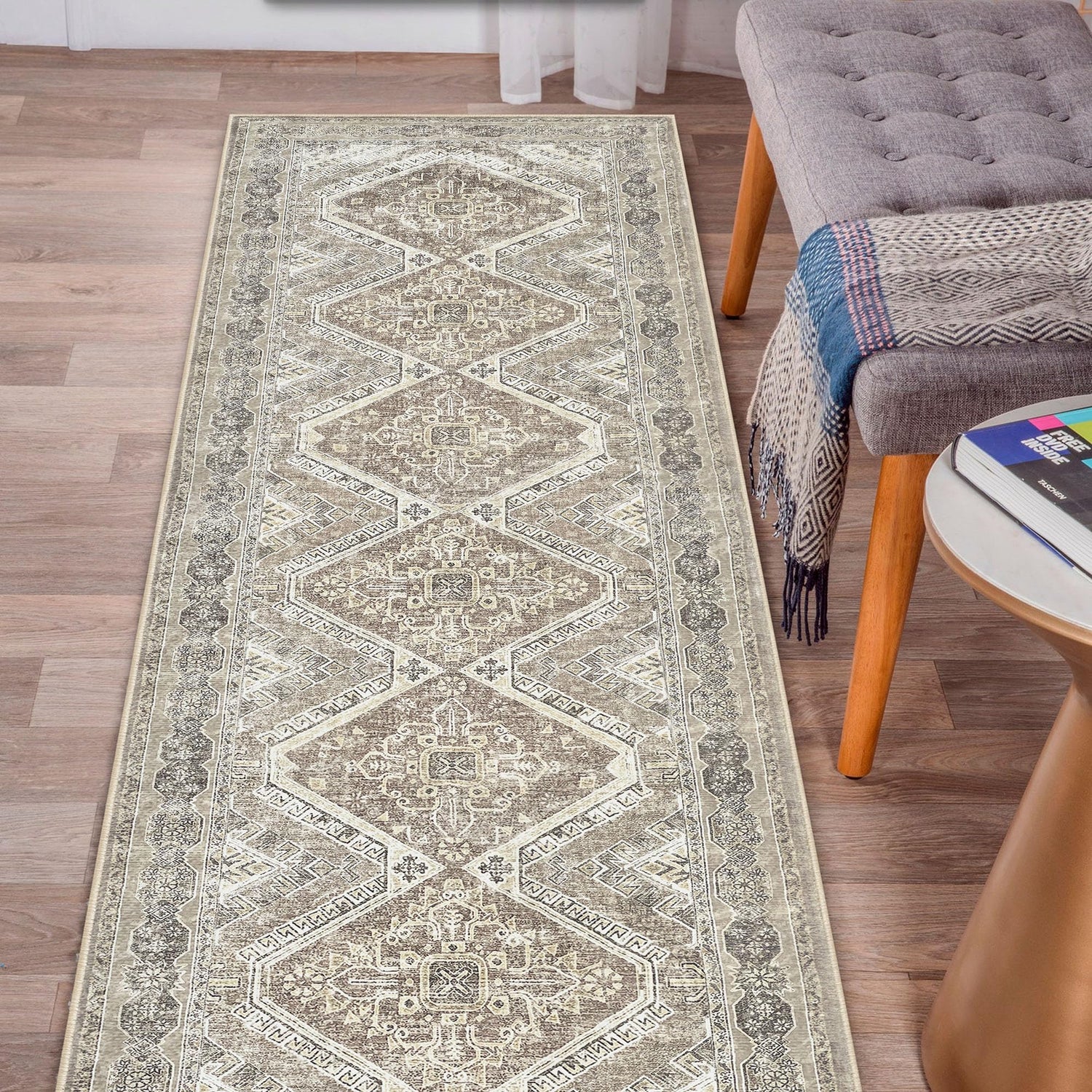 KUTA Extra Long Runner Rug for Hallway 2.6x18ft, Oriental Washable Kitchen Runner Ivory, Non-Slip Stair Runners Indoor Soft Printed Distressed Tribal Farmhouse Carpet Large Area Runner