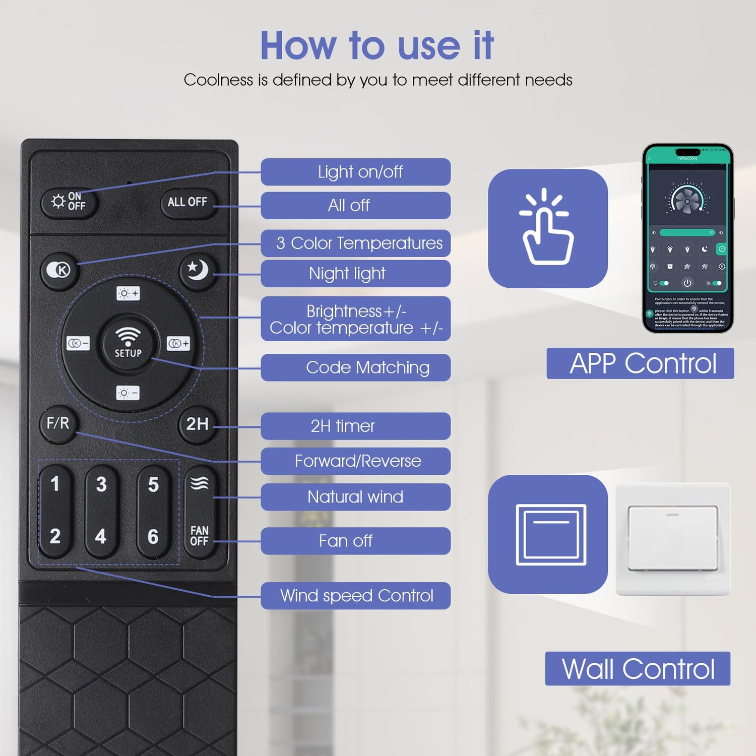 - Remote and APP Control: The remote control offers 6-speed wind speed, 3-color temperature and endless dimming, one-click on night light mode, 2-hour timing off, separate light/fan control, etc. In addition, the fan and light can be controlled via a smartphone APP, replacing the traditional ceiling fan or light switch for added convenience.