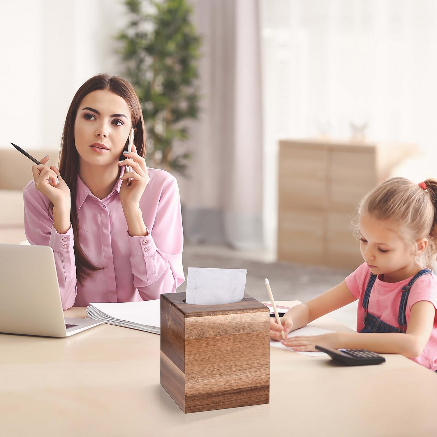 KYDIFS Tissue Box Cover Square, Acacia Wood Tissue Box Holder with Slide-Out Bottom, Wooden Tissue Box Cover Cube for Bathroom, Bedroom, Dinner Table, Office,Kitchen(Square)