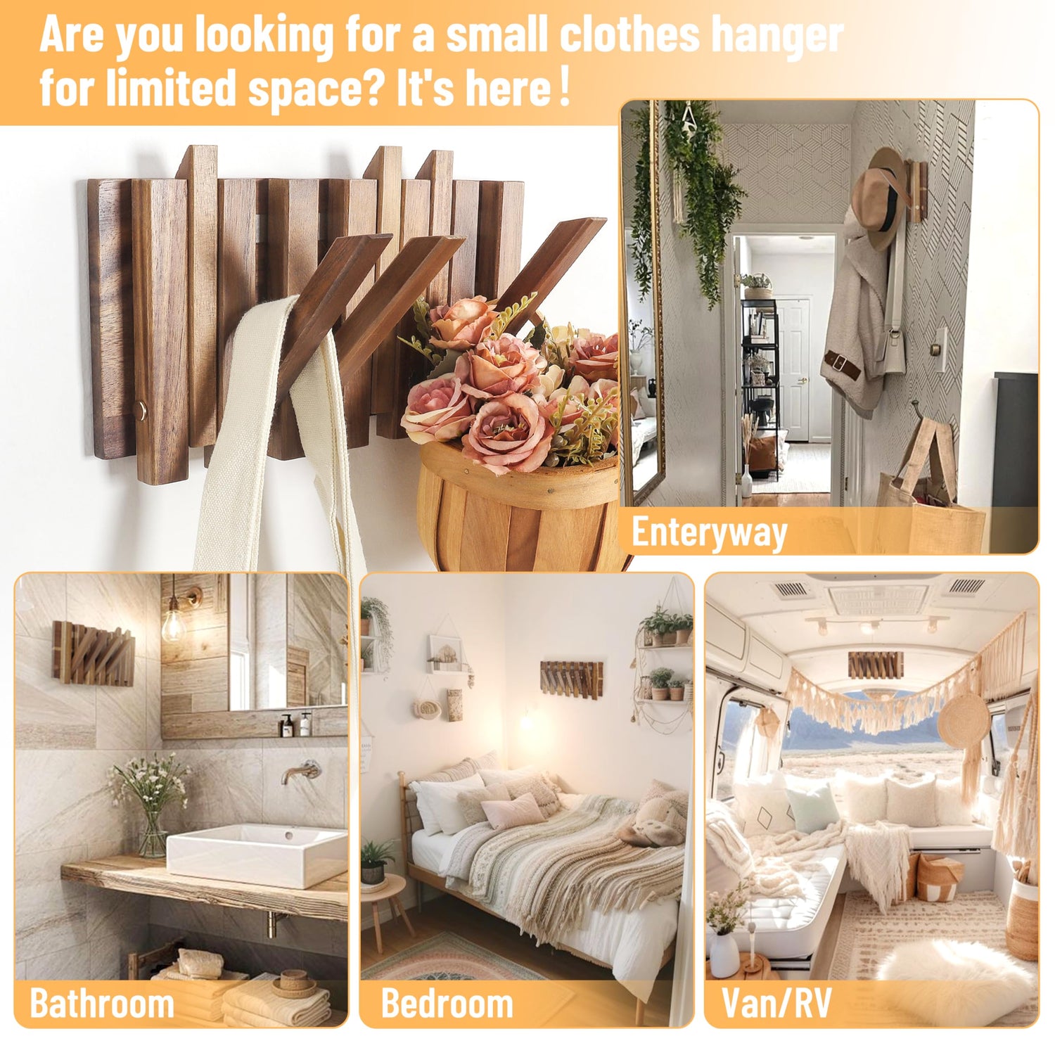 KYIAANY Coat Rack Wall for Farmhouse: Wood Rustic 6 Hooks Mount 10.4inch Retractable Wall Mounted for Small Spaces Entryway Hallway Bathroom for Hanging Jacket Towel Backpack Bag