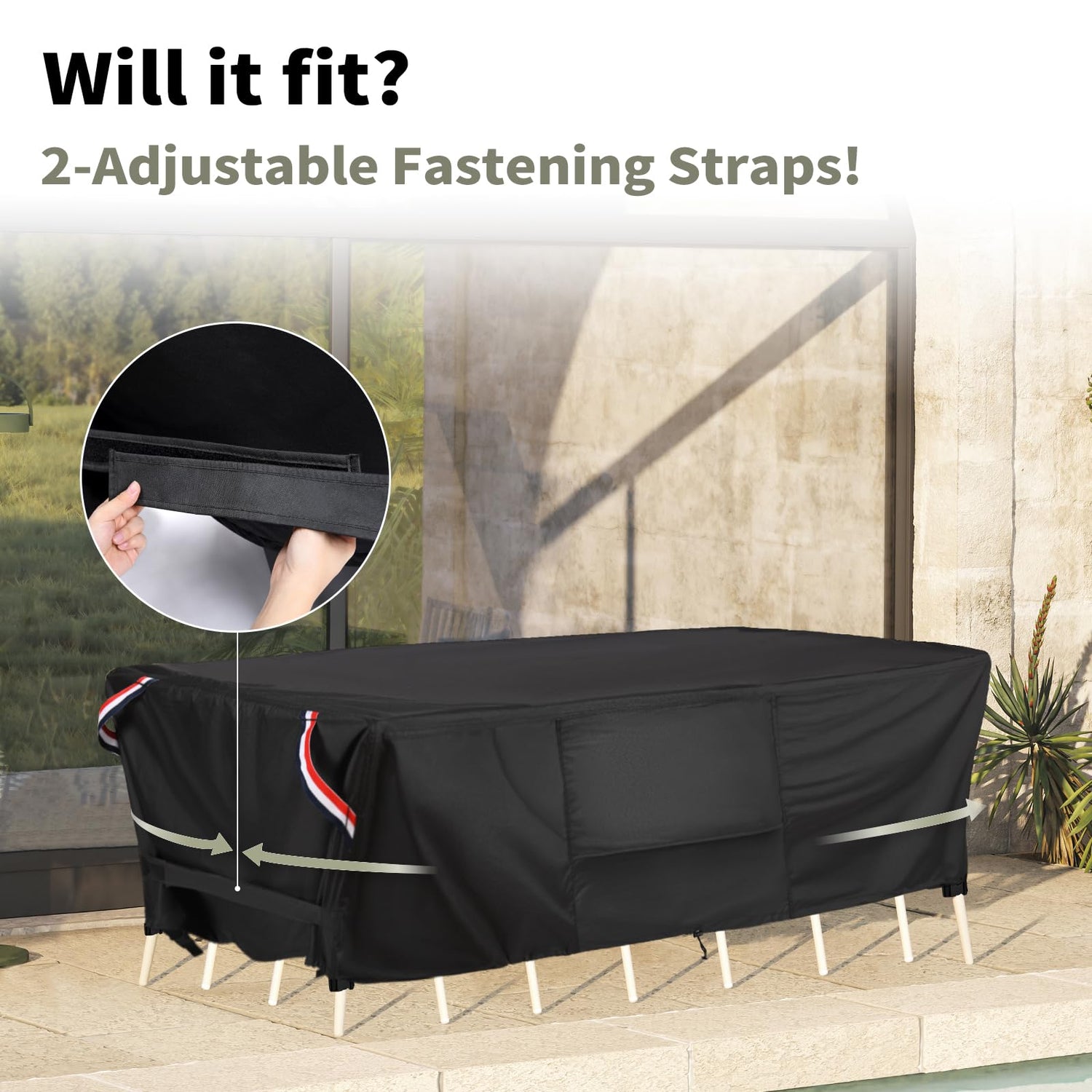 - Easy to fold and store- Our outdoor patio table covers is made of lightweight, soft material so that you can easily fold and store it on your own. What else? We have specially designed 2 adjustable fastening straps to assist you in reusing and storing it more conveniently.