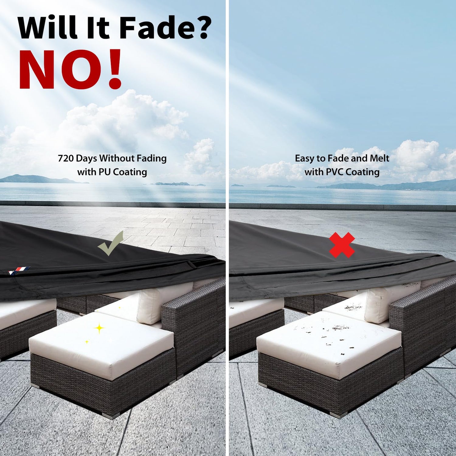 - Why won’t it fade? - The heat- and stain-resistant PU material has passed an 80-hour color stability test, which means that it can withstand 720 days of UV exposure without fading. It helps protect your patio furniture covers from damage caused by prolonged sun exposure. Your furniture is less likely to get stained thanks to the heat-resistant PU material.