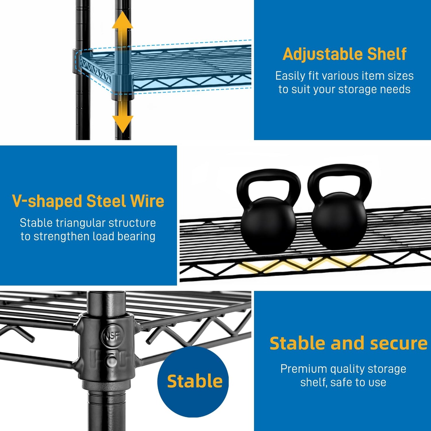 - 49.2''W big Size Wire Shelving Unit -- The 49.2 "W storage rack is twice the size of the market shelves, which is truly a blessing for storage enthusiasts to easily meet more storage needs. And it can be suitable for commercial grade heavy-duty shelving needs in a wide range of scenarios, such as living rooms, kitchens, garages, and even supermarkets.