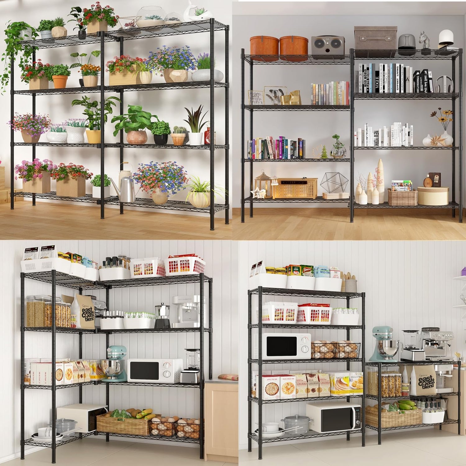 - Adjustable Wire Shelving to Meet Different Needs -- The height spacing of each shelf can be adjusted according to individual storage needs. We can not only connect them into 2 rows for assembly, but also design and assemble them with L-shaped corners. We can even split them into two separate shelves, which is equivalent to having two sets of single row shelves and multiple style shelves at the same price. Therefore, there is no need to worry about insufficient scene space and inability to use, making perfect use of every space with extremely high cost-effectiveness.